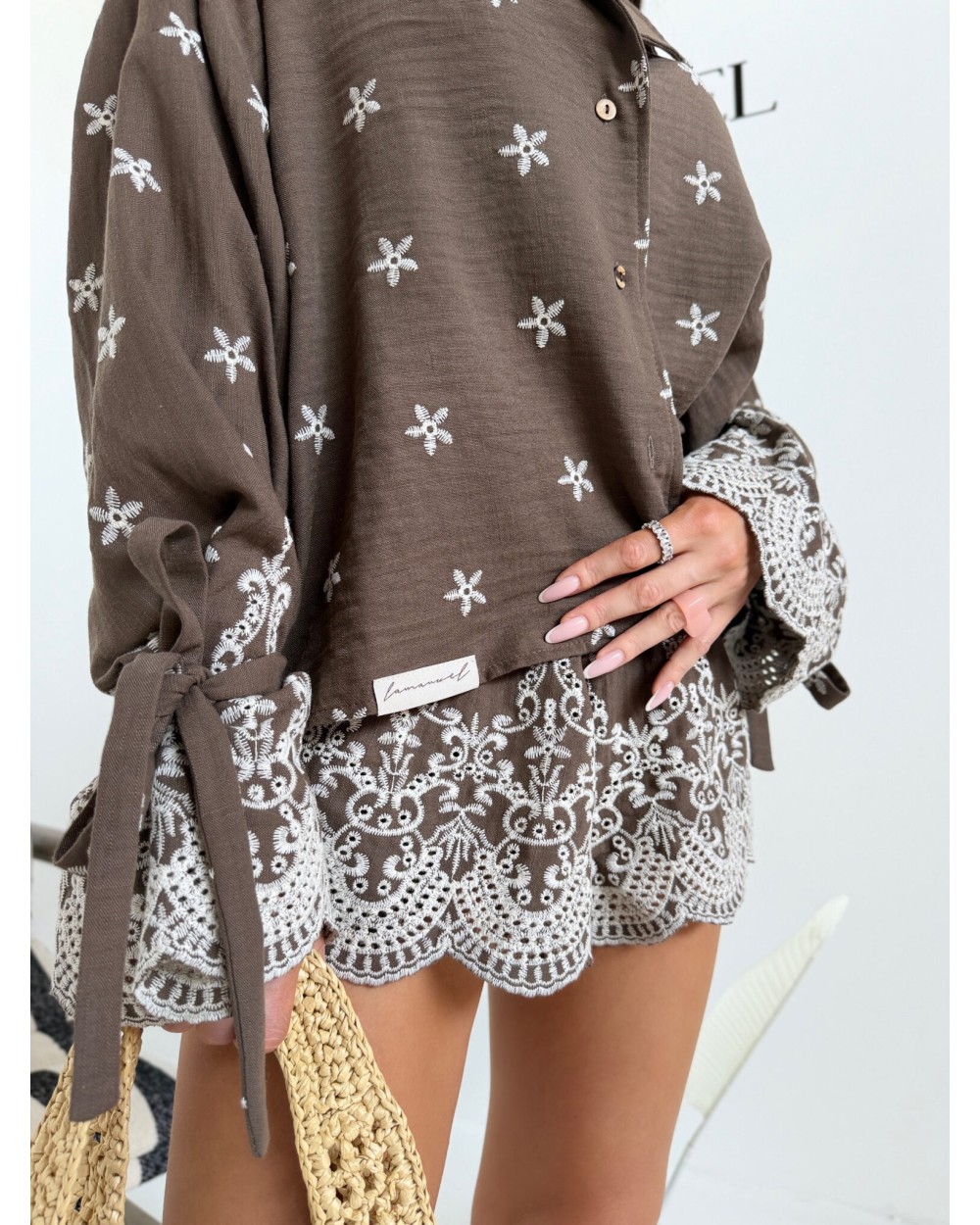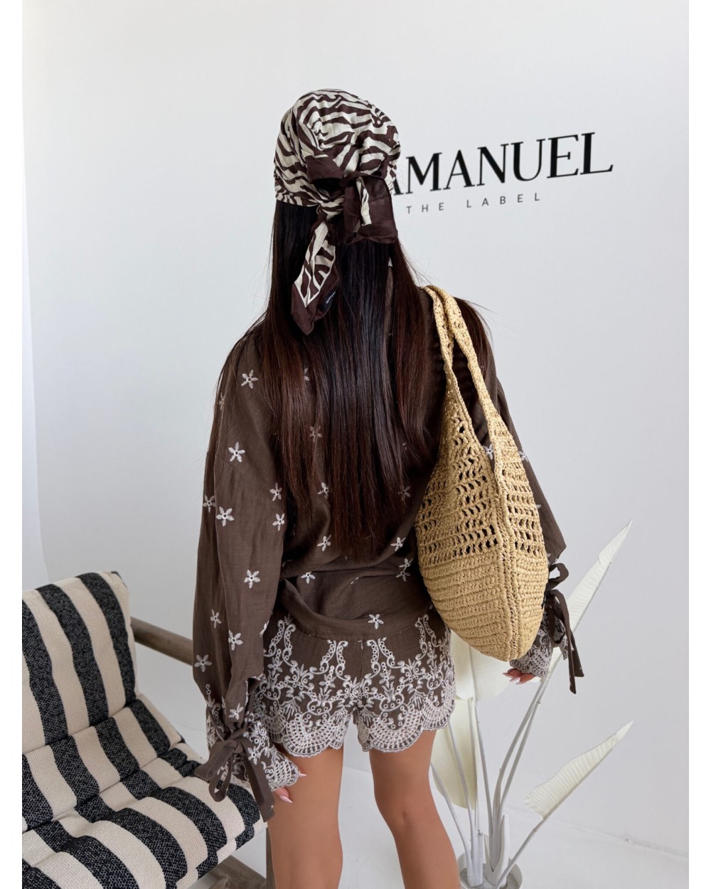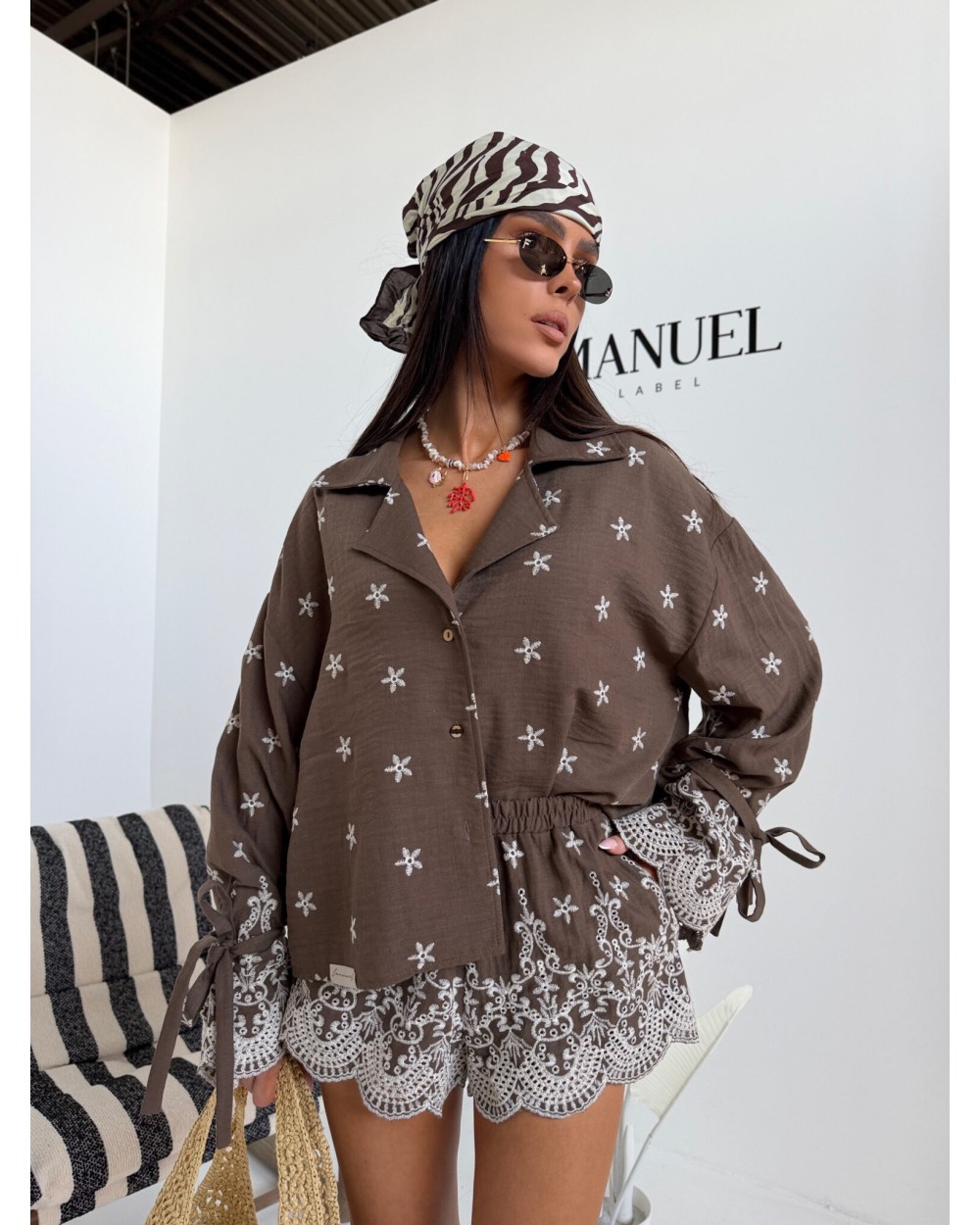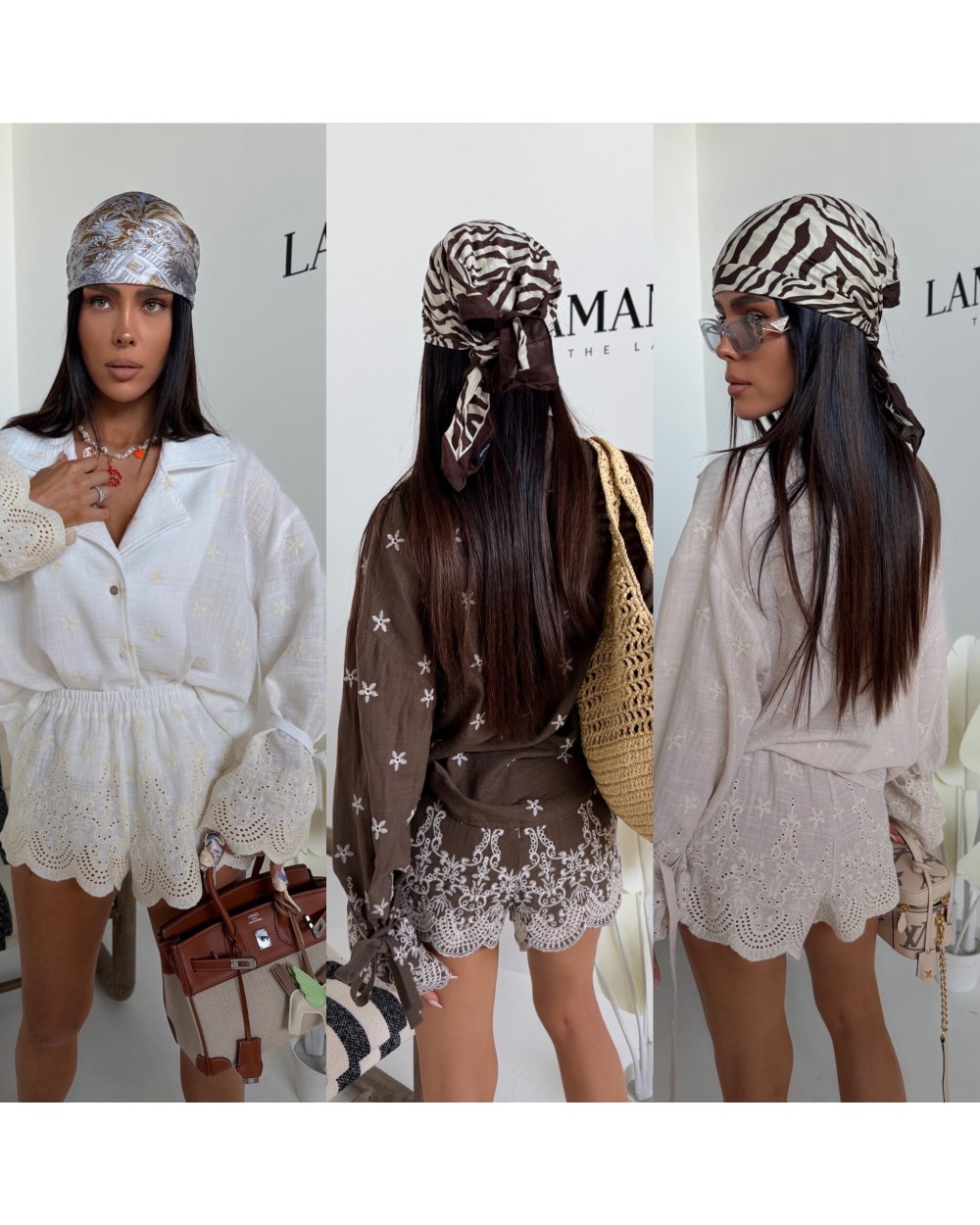 Lekkość, która przyciąga detalem. Zwiewna koszula o luźnym kroju subtelnie układa się na sylwetce, tworząc naturalny, niewymuszony efekt, a haftowane wykończenia dodają całości romantycznego charakteru. Szerokie rękawy zakończone ozdobną koronką podkreślają wyjątkowość formy i nadają stylizacji wyrazistości. Szorty z ażurowym wykończeniem eksponują nogi i wprowadzają letni, świeży vibe, jednocześnie zachowując komfort dzięki elastycznej talii. Całość tworzy spójny, kobiecy look idealny na ciepłe dni – lekki, ale dopracowany w każdym detalu.