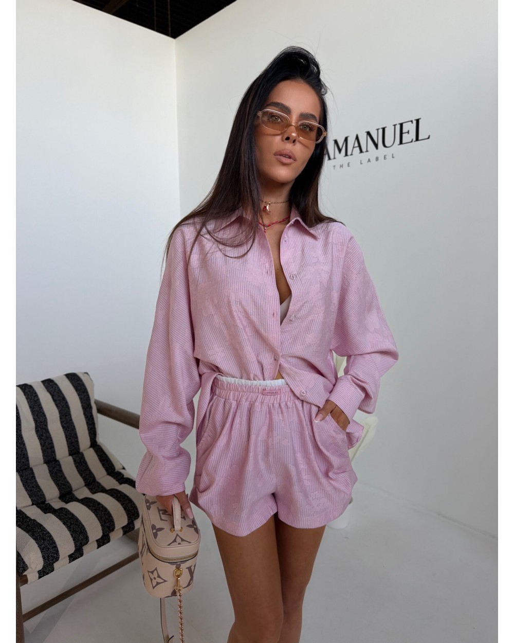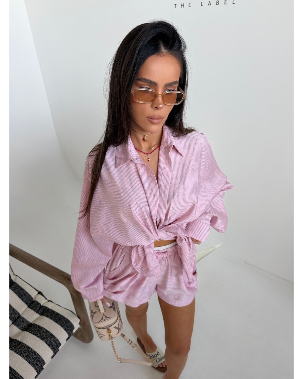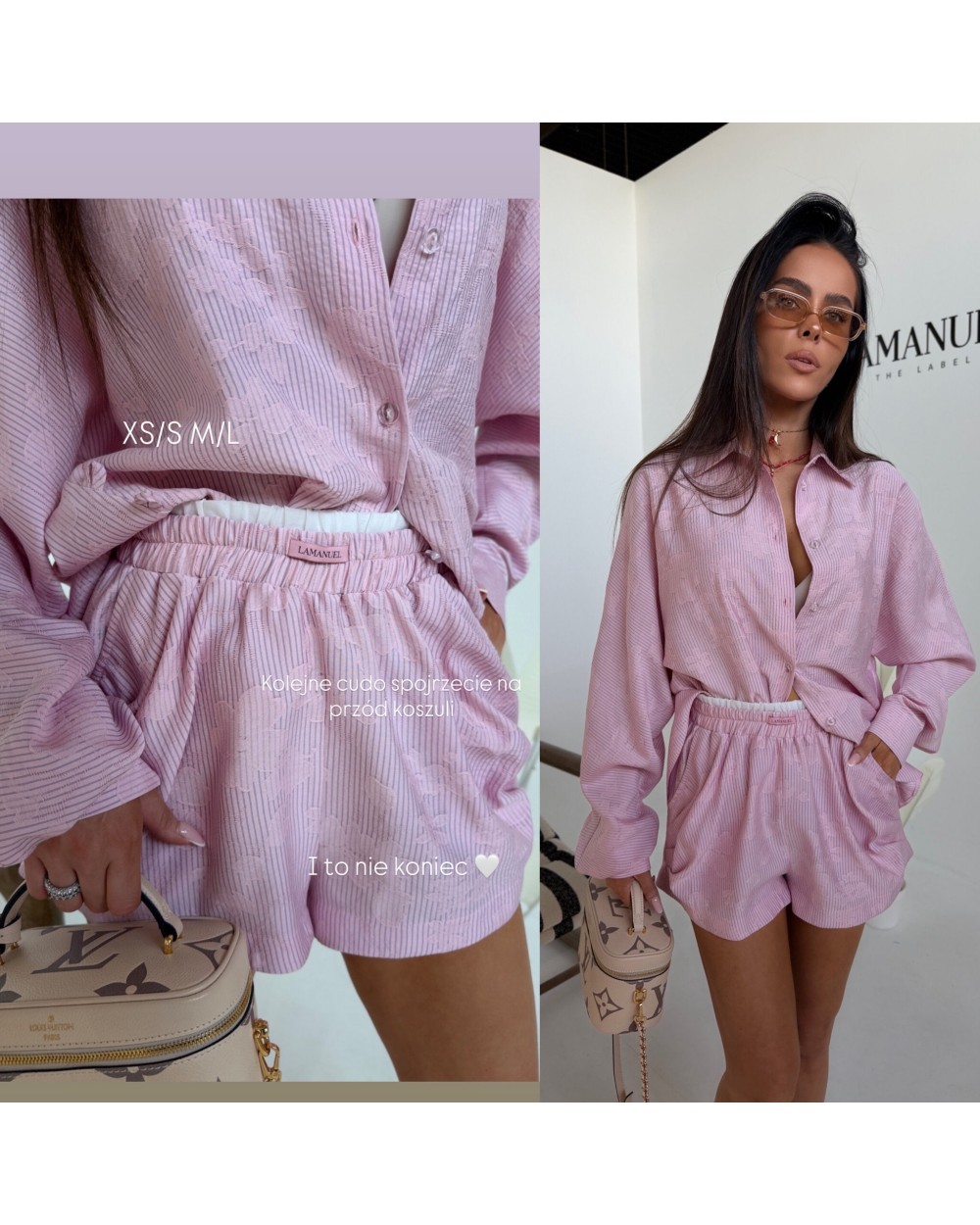 Swobodna forma z dopracowanym detalem, który zmienia charakter całej sylwetki. Luźniejsza, wydłużona koszula daje efekt lekkości i nonszalancji, a dzięki zapięciu na guziki po bokach można ją modelować w talii, podkreślając proporcje i nadając bardziej kobiecej linii. Delikatna struktura materiału dodaje głębi i subtelnej elegancji, zachowując przy tym codzienny komfort. Szorty z podwójną gumą w pasie idealnie dopasowują się do sylwetki, zapewniając wygodę i stabilne ułożenie. Całość tworzy nowoczesny, lekko wakacyjny look, który łączy luz z wyrafinowanym wykończeniem.