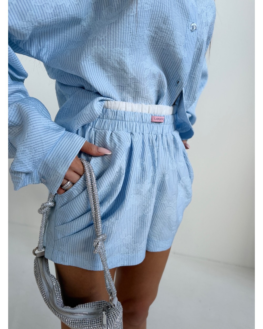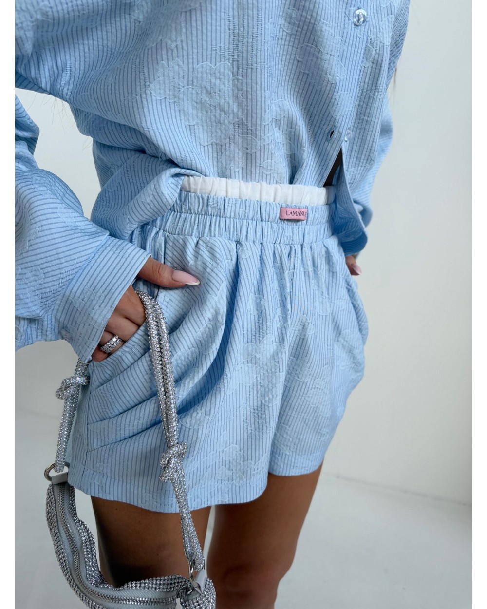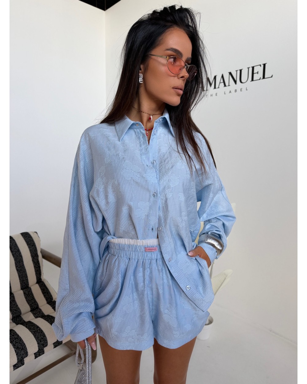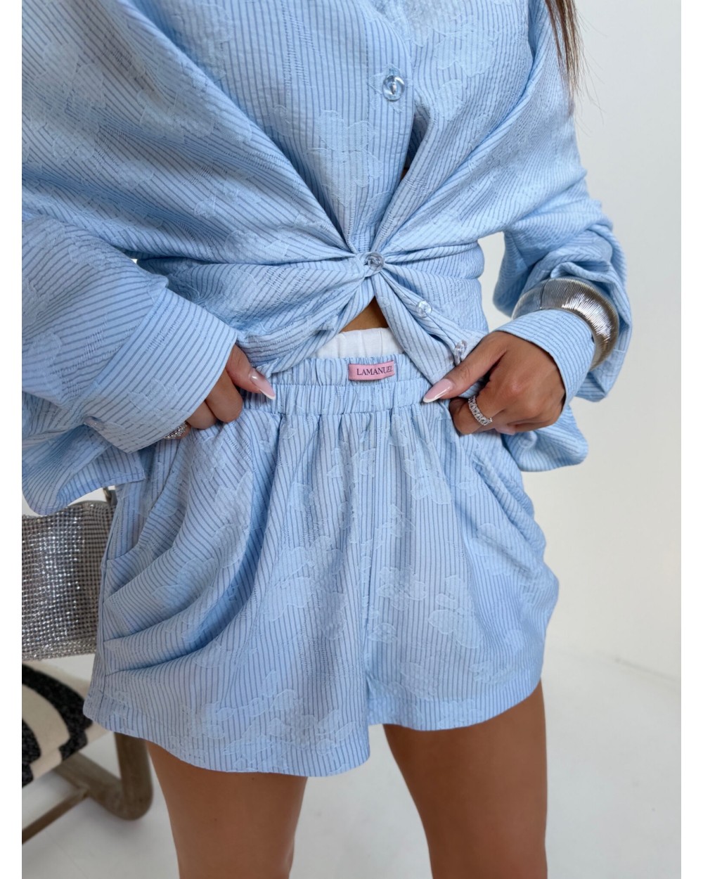 Swobodna forma z dopracowanym detalem, który zmienia charakter całej sylwetki. Luźniejsza, wydłużona koszula daje efekt lekkości i nonszalancji, a dzięki zapięciu na guziki po bokach można ją modelować w talii, podkreślając proporcje i nadając bardziej kobiecej linii. Delikatna struktura materiału dodaje głębi i subtelnej elegancji, zachowując przy tym codzienny komfort. Szorty z podwójną gumą w pasie idealnie dopasowują się do sylwetki, zapewniając wygodę i stabilne ułożenie. Całość tworzy nowoczesny, lekko wakacyjny look, który łączy luz z wyrafinowanym wykończeniem.