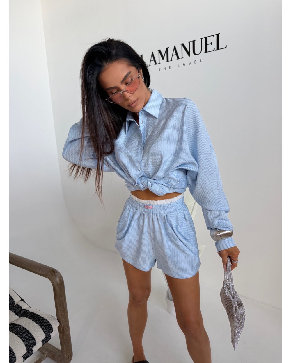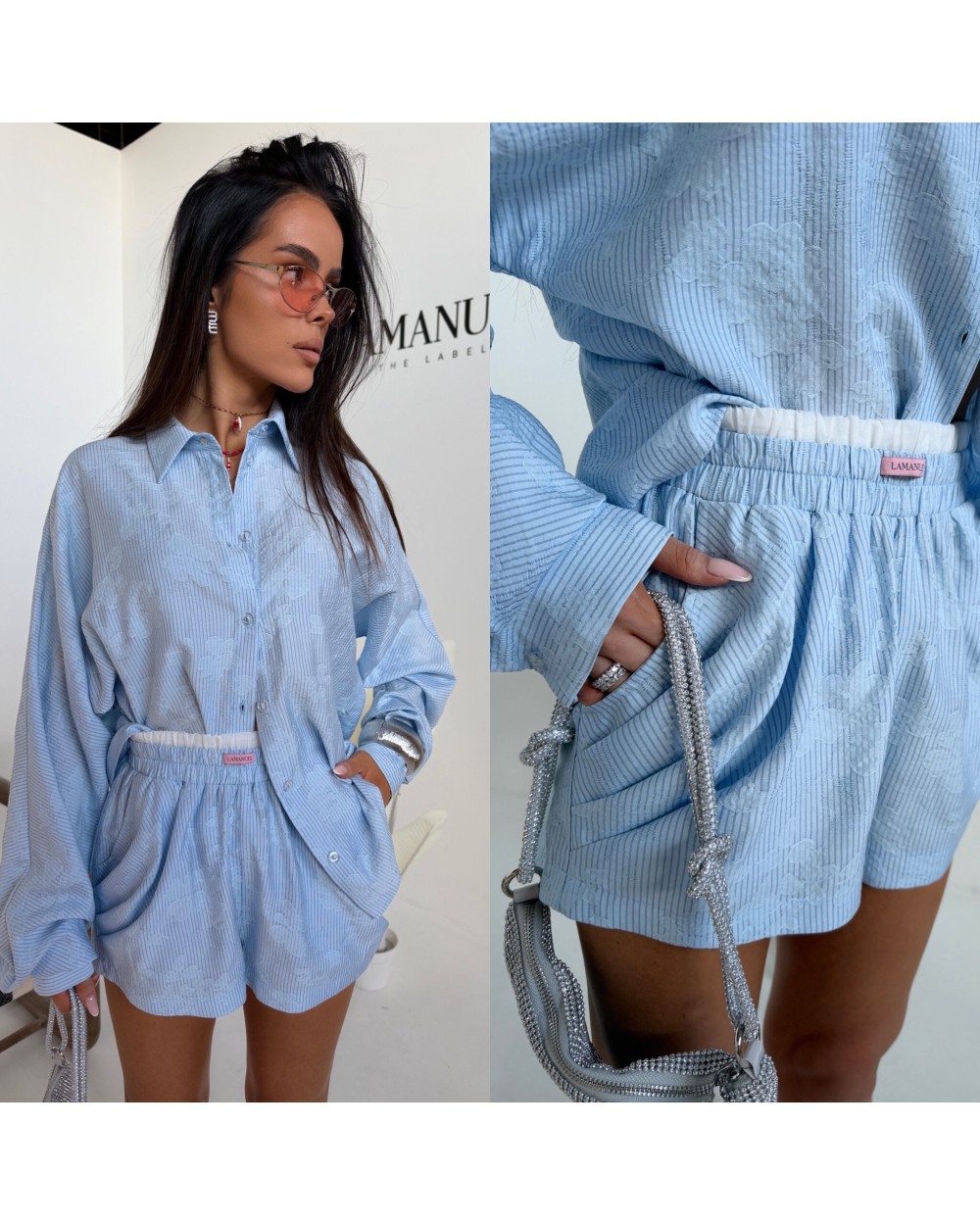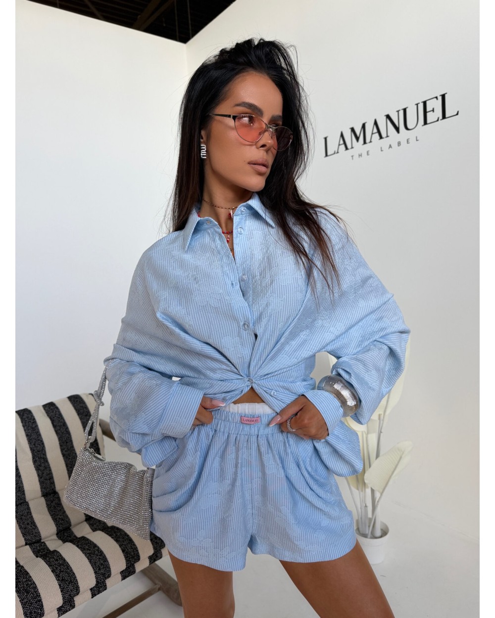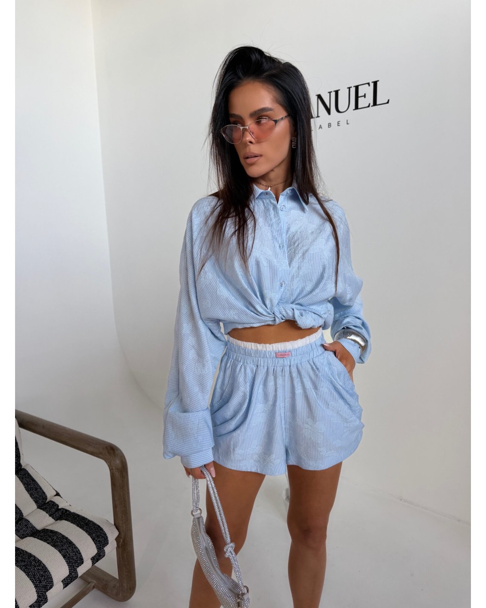 Swobodna forma z dopracowanym detalem, który zmienia charakter całej sylwetki. Luźniejsza, wydłużona koszula daje efekt lekkości i nonszalancji, a dzięki zapięciu na guziki po bokach można ją modelować w talii, podkreślając proporcje i nadając bardziej kobiecej linii. Delikatna struktura materiału dodaje głębi i subtelnej elegancji, zachowując przy tym codzienny komfort. Szorty z podwójną gumą w pasie idealnie dopasowują się do sylwetki, zapewniając wygodę i stabilne ułożenie. Całość tworzy nowoczesny, lekko wakacyjny look, który łączy luz z wyrafinowanym wykończeniem.