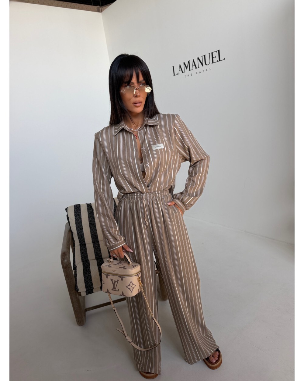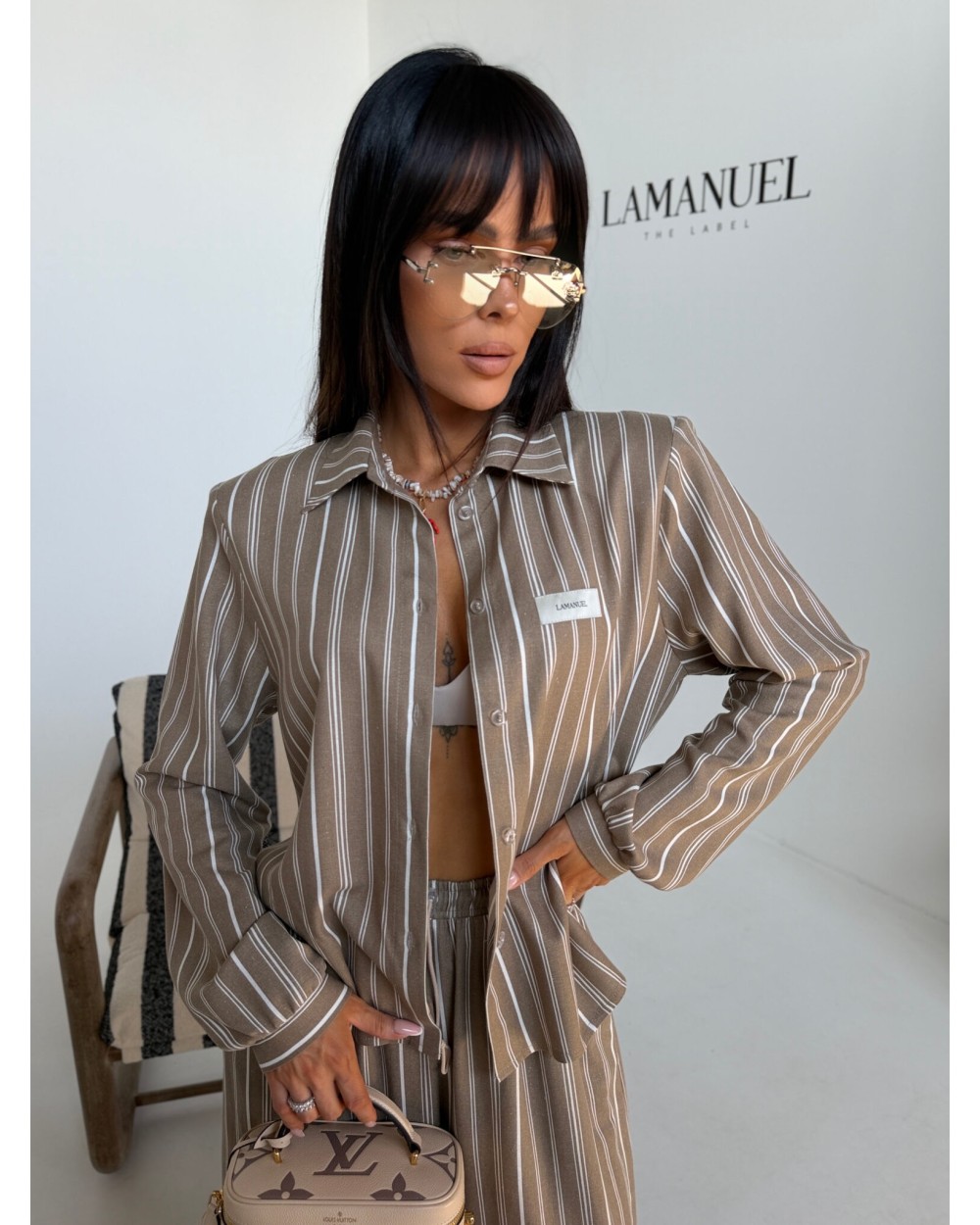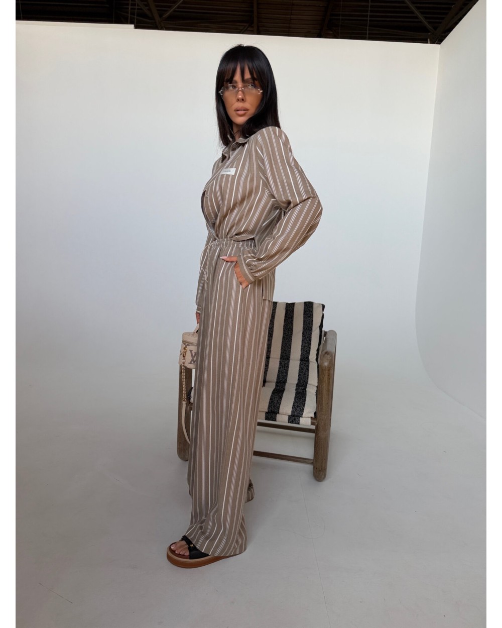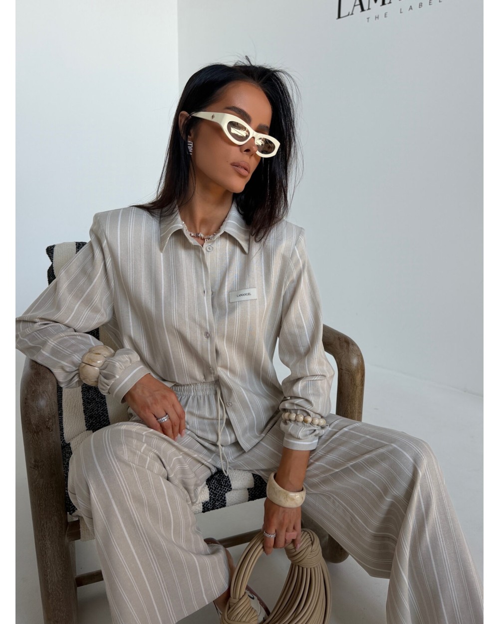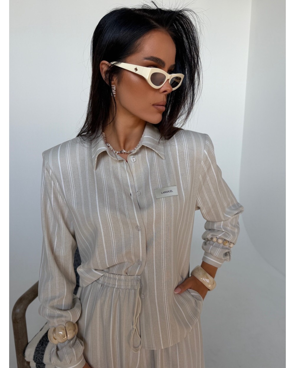 Elegancja w swobodnym wydaniu, która buduje sylwetkę już samą formą. Strukturalna góra z wyraźnie zaznaczoną linią ramion nadaje całości charakteru i pewności siebie. Koszula o dopracowanym kroju idealnie współgra ze spodniami z wysokim stanem, tworząc proporcje, które wydłużają i wysmuklają sylwetkę. Naturalna tkanina na bazie wiskozy, bawełny i lnu zapewnia lekkość oraz komfort noszenia nawet w cieplejsze dni. Subtelny wzór w pionowe pasy dodaje elegancji, a jednocześnie zachowuje nowoczesny, niewymuszony styl. Komplet, który sprawdzi się zarówno w codziennym ruchu, jak i w bardziej dopracowanych stylizacjach.