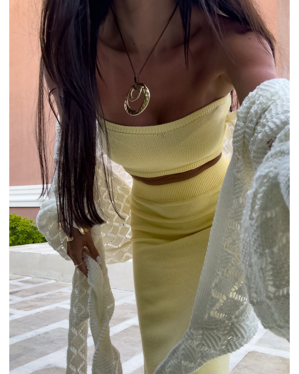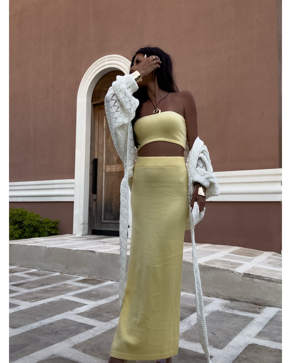 Stylowy i kobiecy komplet wykonany z wysokiej jakości, elastycznego materiału z dodatkiem kaszmiru. Top typu opaska idealnie dopasowuje się do sylwetki, podkreślając ramiona i dekolt. Długa spódnica maxi z efektownym rozcięciem po jednej stronie subtelnie eksponuje nogę i dodaje lekkości całej stylizacji. Materiał jest przyjemny w dotyku, miękko otula ciało i delikatnie modeluje figurę. Idealny wybór na wieczorne wyjście, letnie przyjęcie lub stylową randkę.