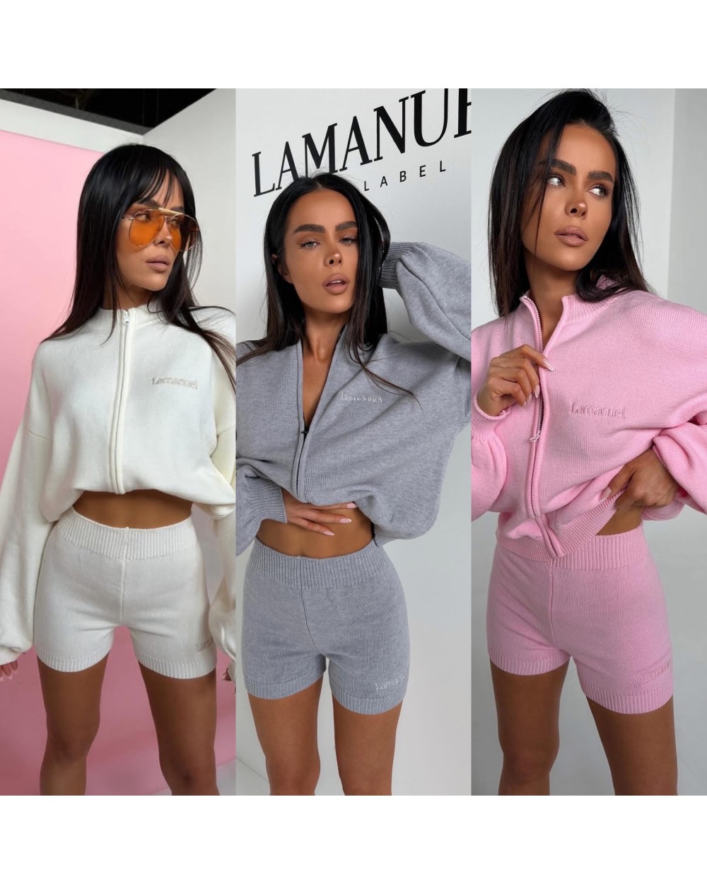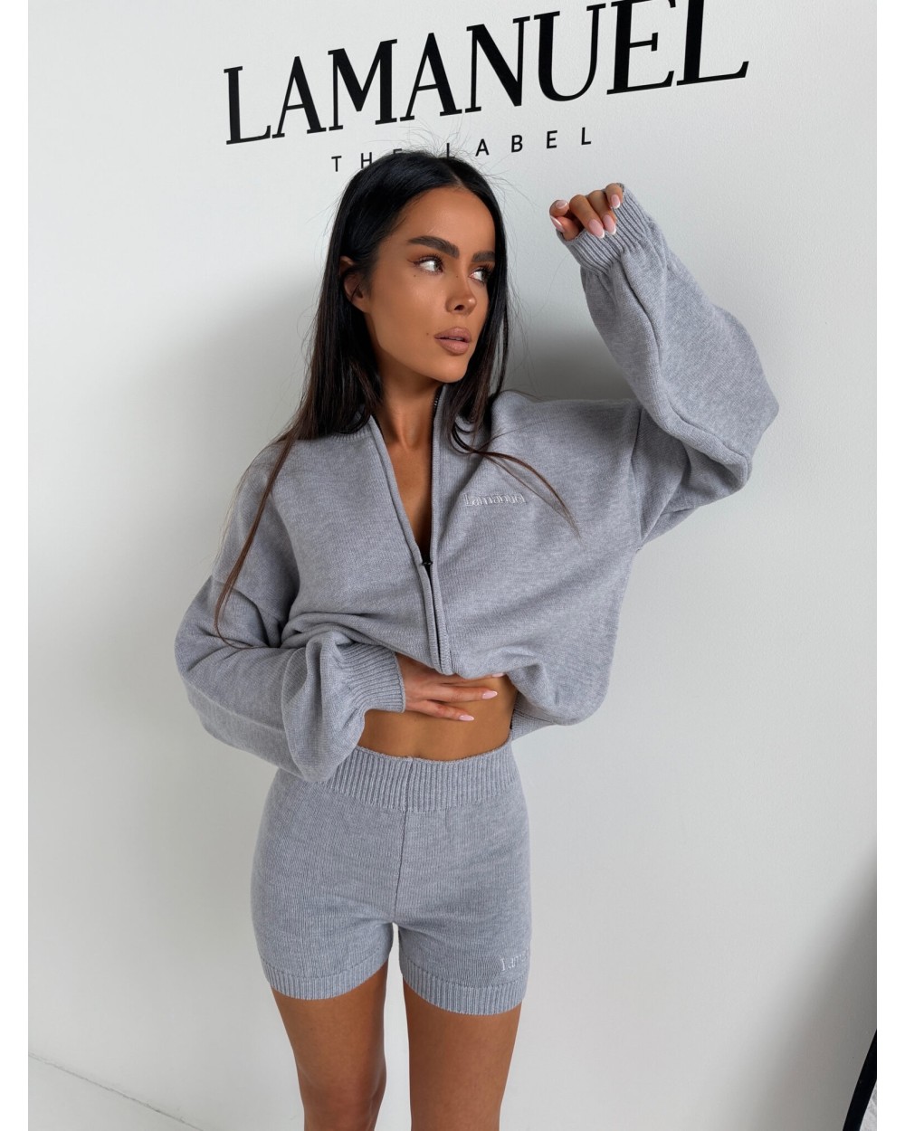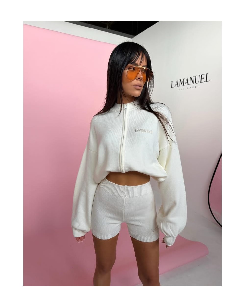 Komplet sweterkowy o miękkiej, przyjemnej w dotyku strukturze. Krótka bluza zapinana na zamek z lekko podniesioną stójką i luźnym rękawem tworzy wyważoną, nowoczesną formę. Dopasowane szorty z wysokim stanem dobrze układają się na sylwetce i podkreślają talię. Całość tworzy spójny, wygodny look z subtelnym brandingiem.