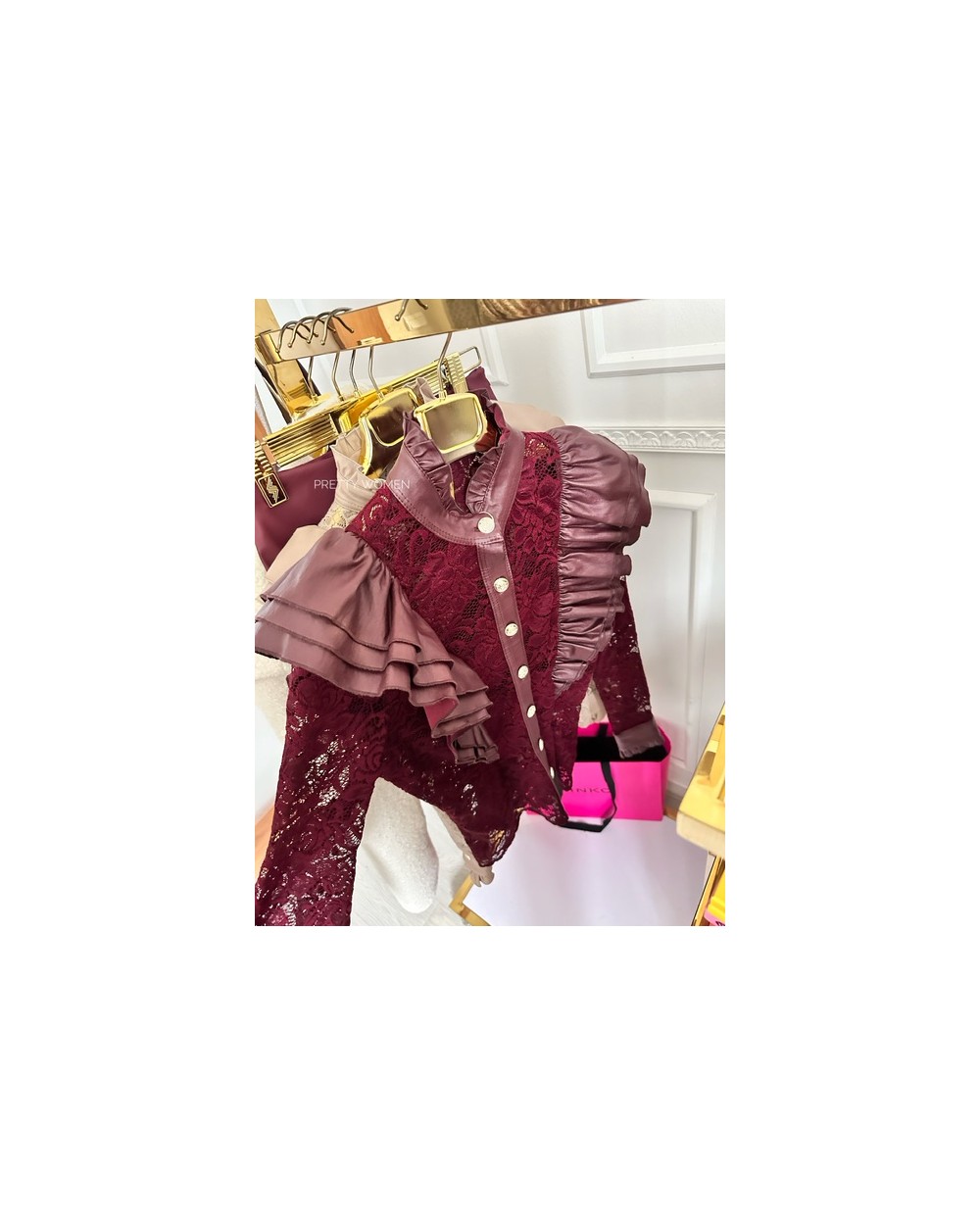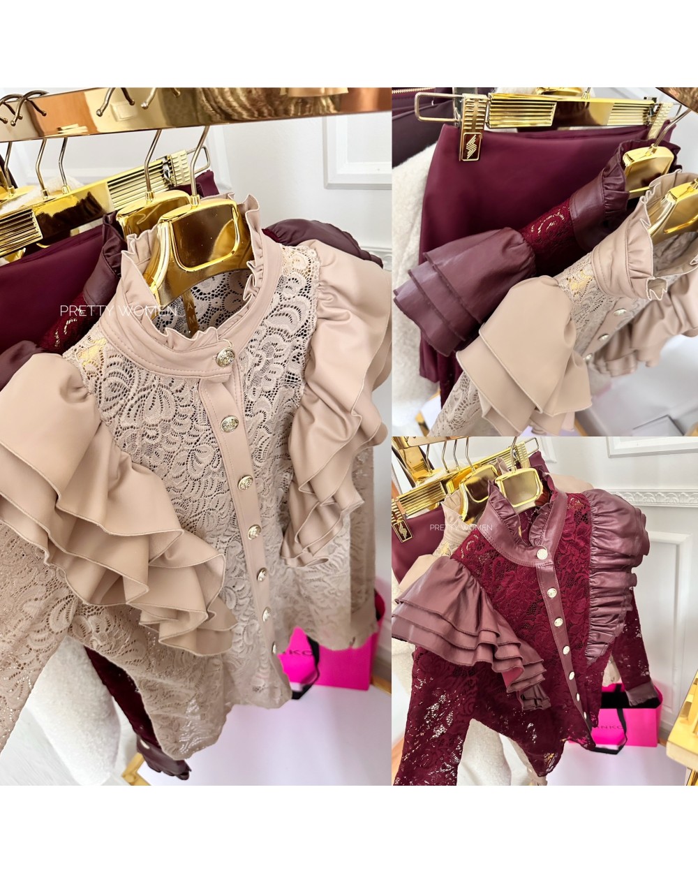 Koszula Vintage została wykonana z przyjemnego w dotyku ażurkowego materiału z dodatkiem eko skóry. Posiada długi rękaw oraz ozdobne falbanki wykonane z eko skóry wszyte symetrycznie z przodu i z tyłu. Stójka w koszuli również została wykonana z eko skóry. Dodatkowo jest zapinana na ozdobne złote guziki. Koszula świetnie się układa i jeszcze lepiej wygląda. Pasuje zarówno do spodni jak i spódnic. Sprawdź sama, a się nie zawiedziesz.