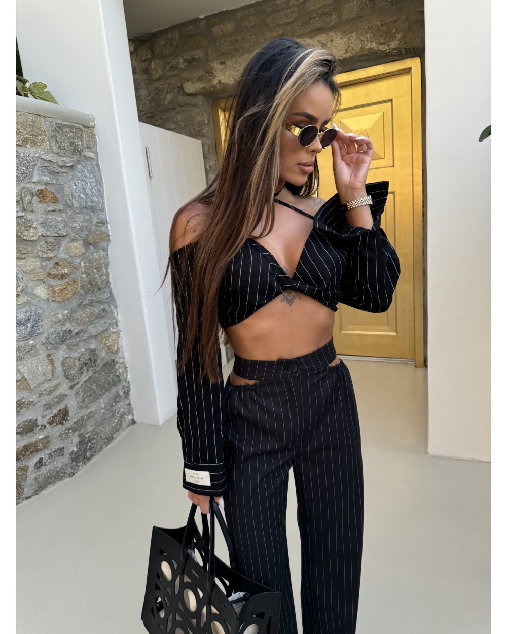 Krótka koszula crop top z długim rękawem, idealna na lato. Wyjątkowy design ze sznurkami przechodzącymi od dekoltu po szyję dodaje jej charakteru i oryginalności. Model w paski, wykonany z lekkiego, przewiewnego materiału, zapewnia komfort noszenia nawet w upalne dni. Doskonale komponuje się zarówno ze spodniami ZUMA, jeansami, jak i spódnicami, tworząc modny i stylowy look na różne okazje.