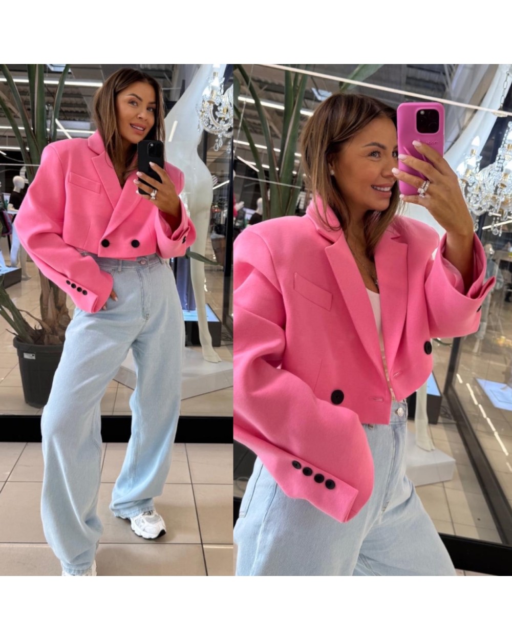- Krótsza marynarka oversize to połączenie nowoczesnej elegancji i komfortu. Jej luźny krój i szerokie klapy dodają stylu każdej stylizacji, idealnie pasując zarówno do jeansów, spódniczki, jak i eleganckich spodni.