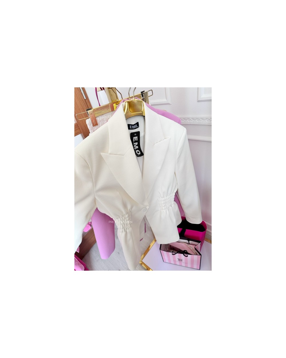 Elegancki żakiet wykonany z wysokiej jakości fakturowanej tkaniny, który zachwyca oryginalnym wzornictwem i ponadczasową klasą. Model podkreśla talię dzięki praktycznemu ściągaczowi w pasie, dodając stylizacji lekkości i kobiecego szyku.
