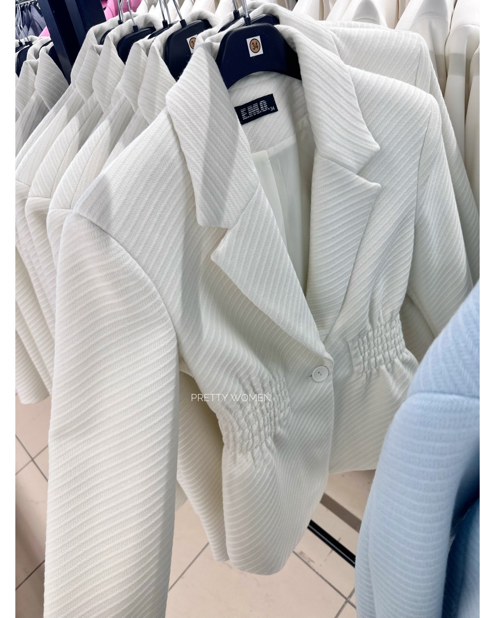 Elegancki żakiet wykonany z wysokiej jakości fakturowanej tkaniny, który zachwyca oryginalnym wzornictwem i ponadczasową klasą. Model podkreśla talię dzięki praktycznemu ściągaczowi w pasie, dodając stylizacji lekkości i kobiecego szyku.