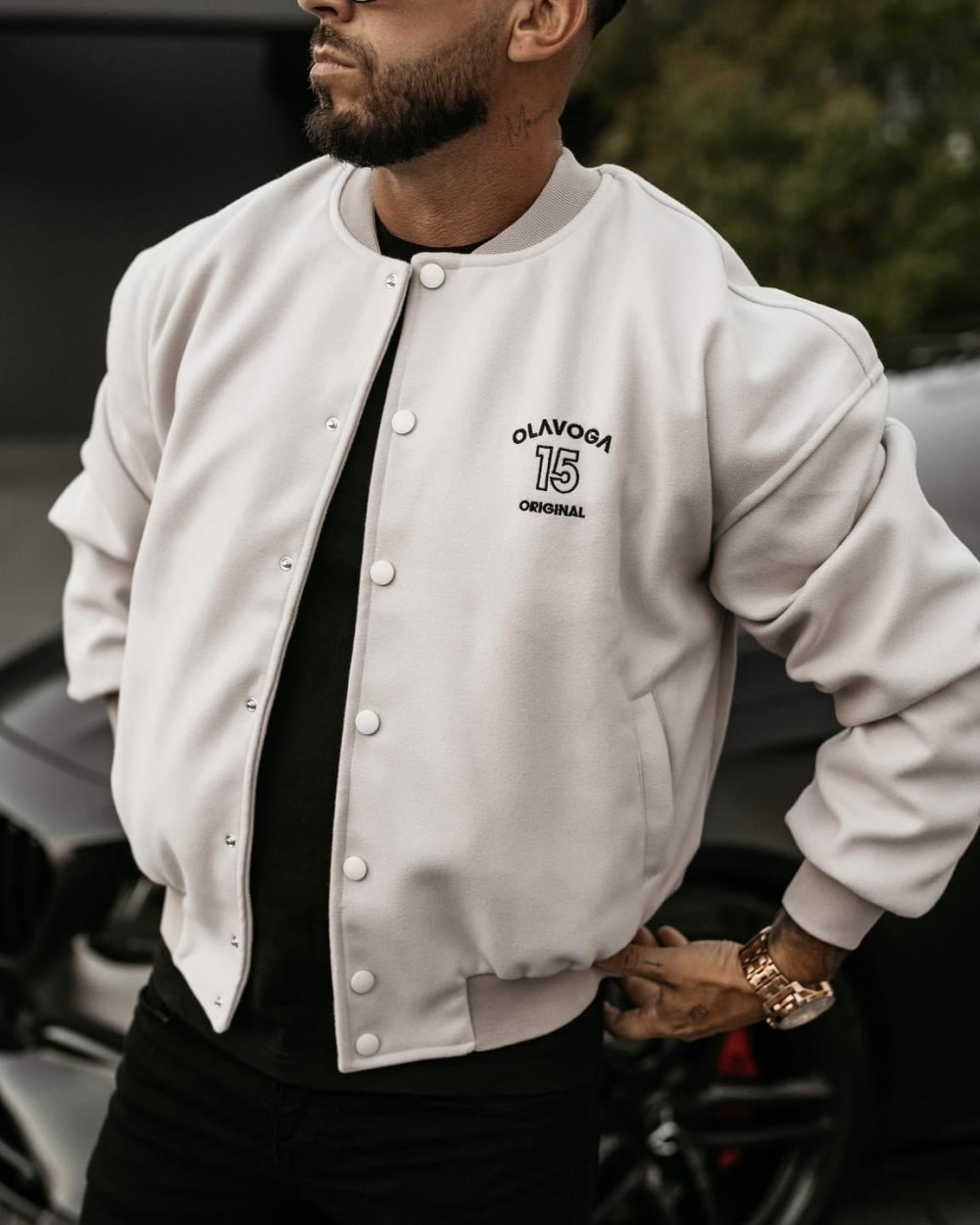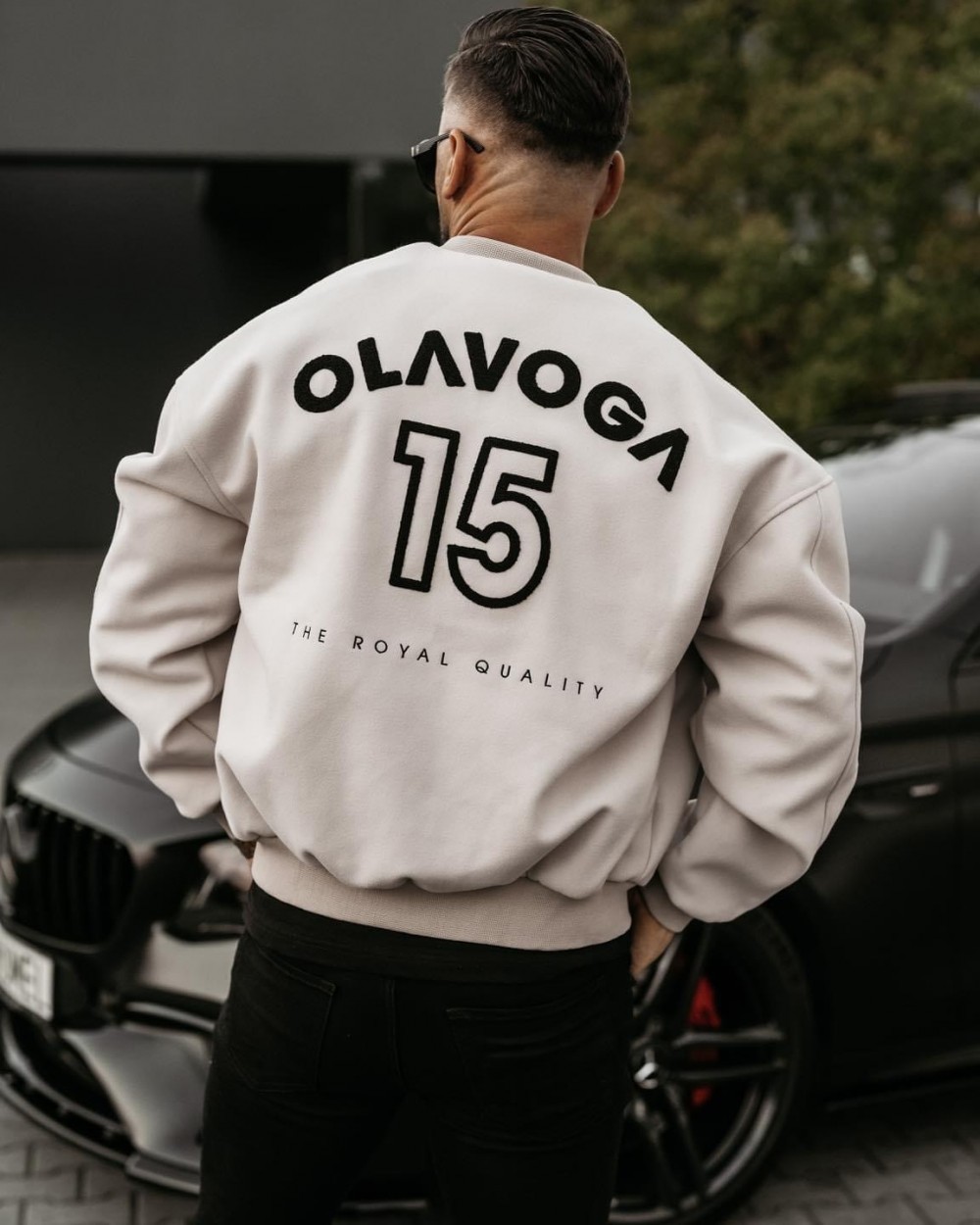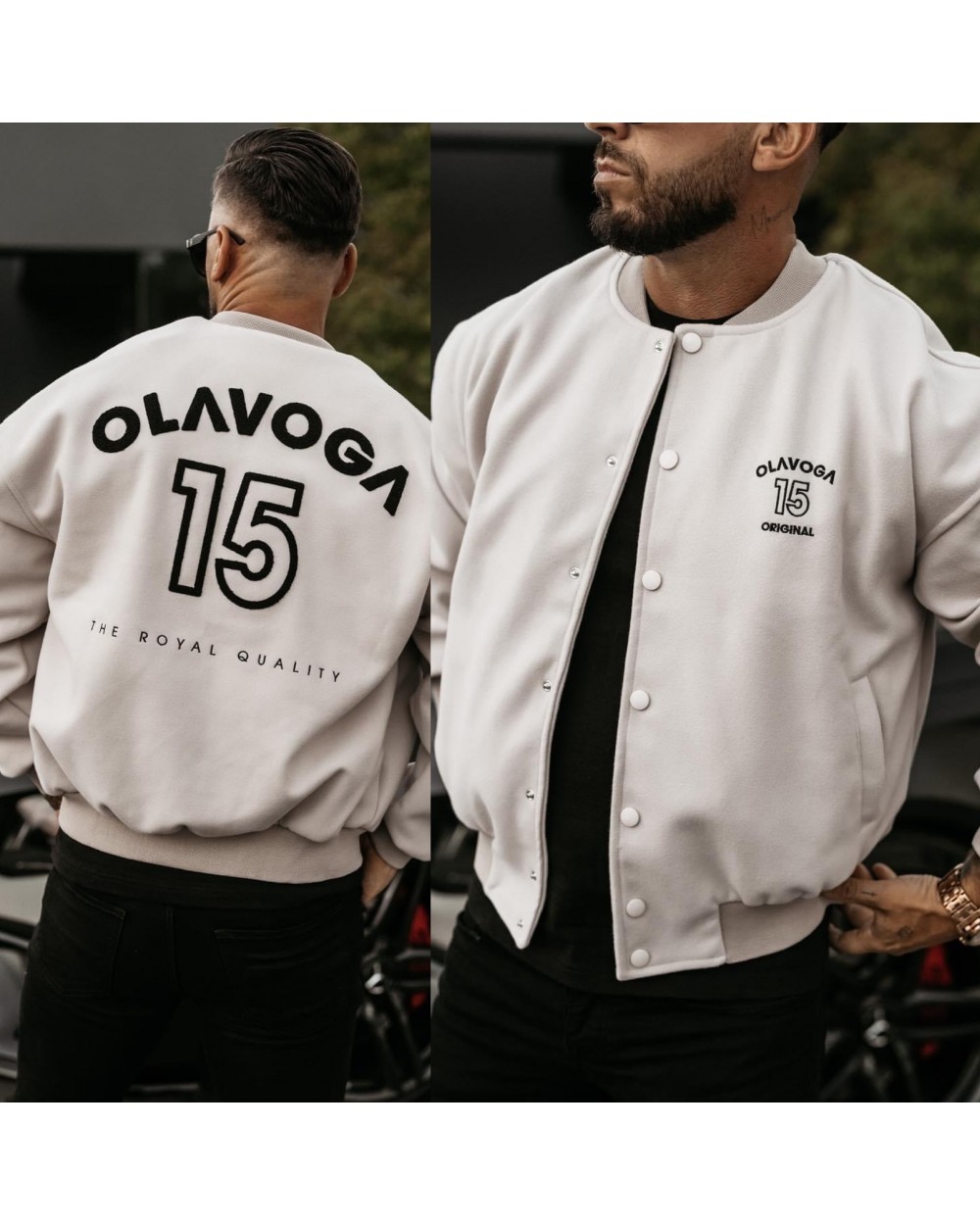 Kurtka męska OLV w stylu bomber jacket. Posiada kieszenie. Na brzegach ściągacze. Na przodzie haftowany napis OLAVOGA 15 ORIGINAL. Z tylu produktu obszerne, haftowane logo marki z 15 THE ROYAL QUALITY. Produkt zaprojektowany w wersji dla niej i dla niego.