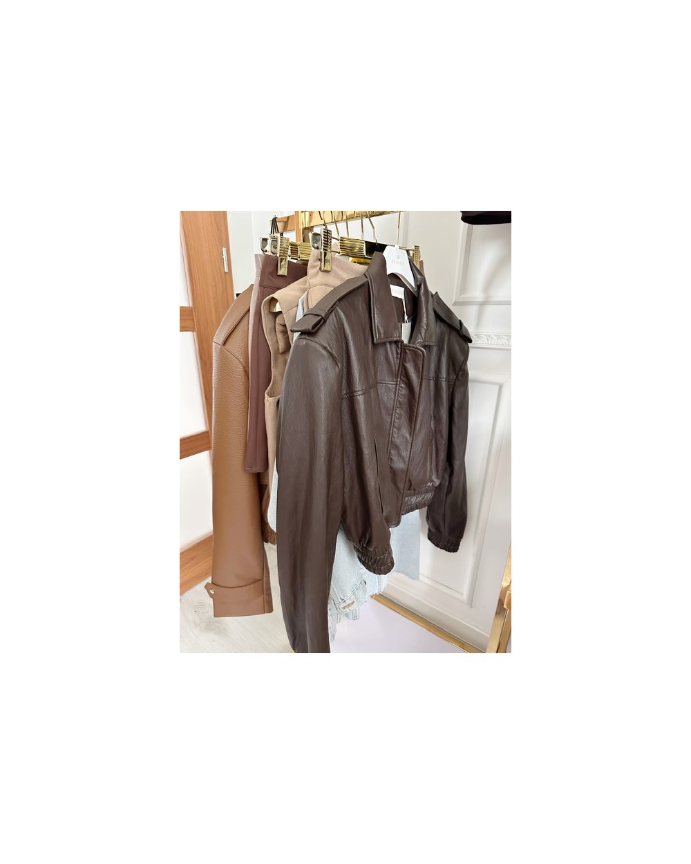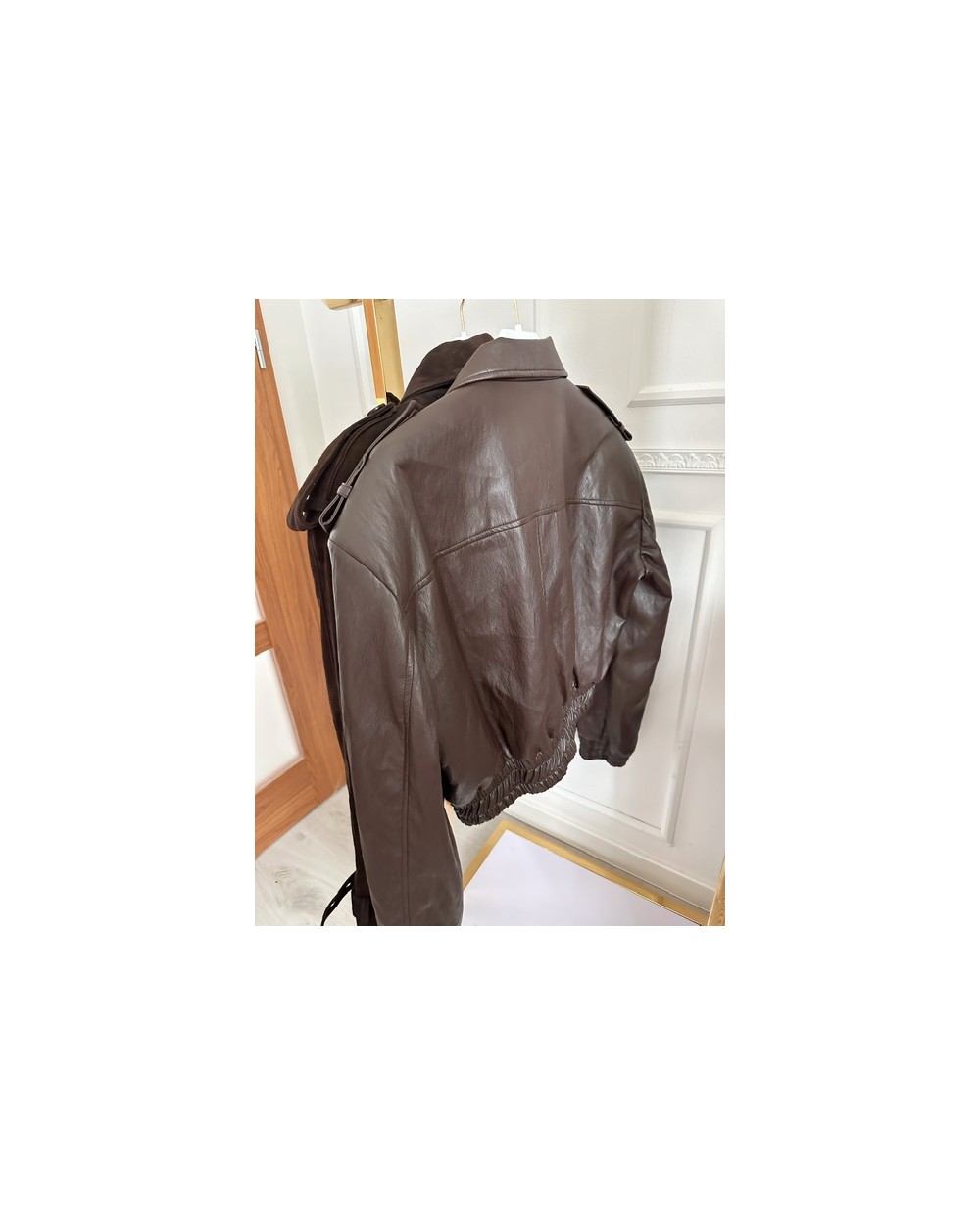 Kurtka z ekoskóry. Z poduszkami na ramionach. Modny fason. Dwie kieszenie. Zapisana na suwak.