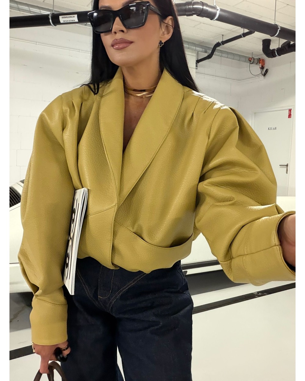 Elegancka, krótka kurtka wykonana z wysokiej jakości ekoskóry o delikatnej naturalnej fakturze. Model z klasycznymi klapami inspirowanymi marynarką, który łączy szykowny styl z nowoczesnym charakterem. Doskonała propozycja do codziennych i bardziej eleganckich stylizacji. Posiada zapięcie na napy.