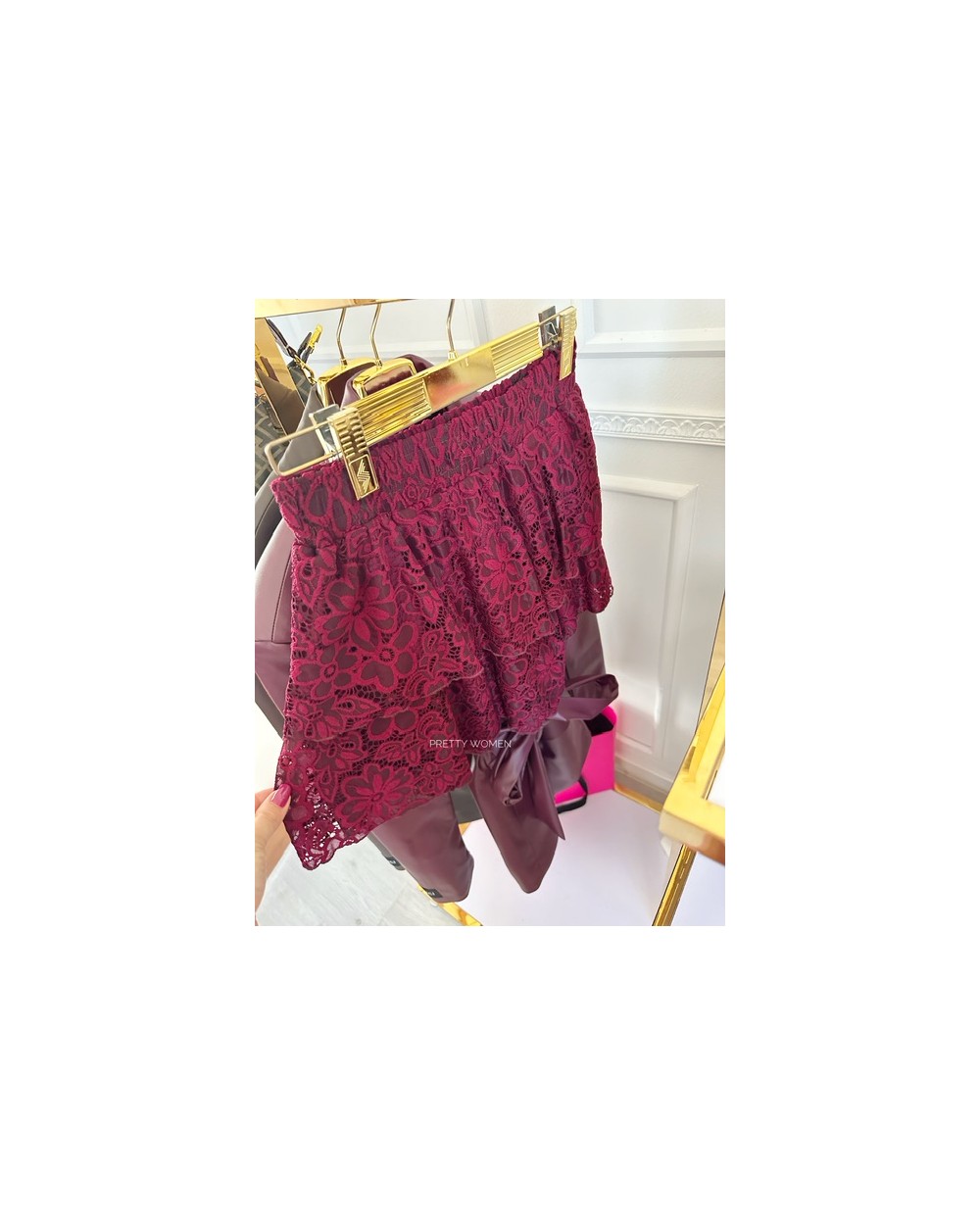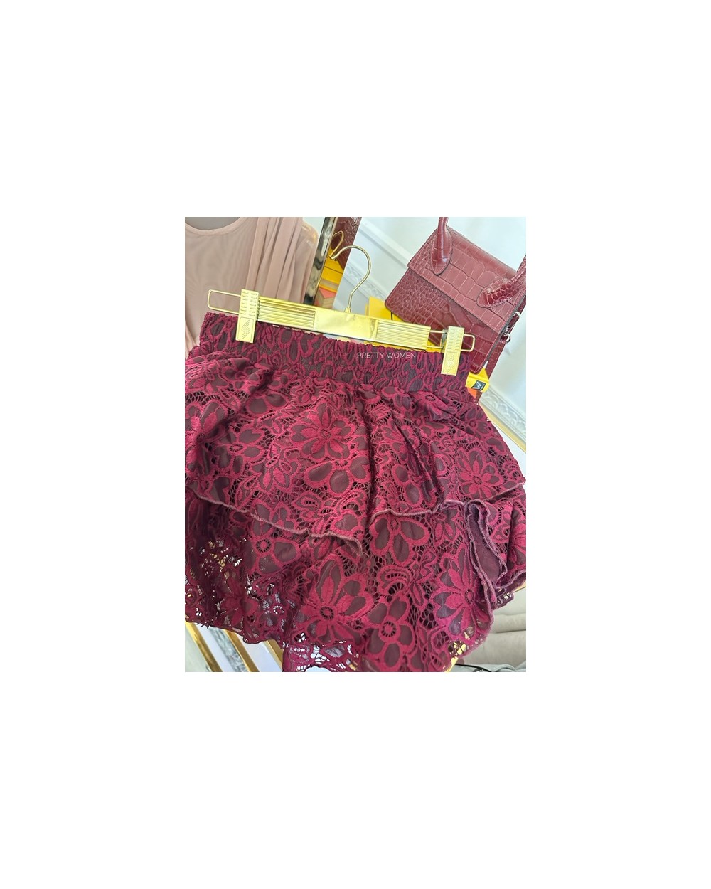 Długość short, koronkowe wykończenie oraz gumka w talii. Zdobienie w postaci falbanek.