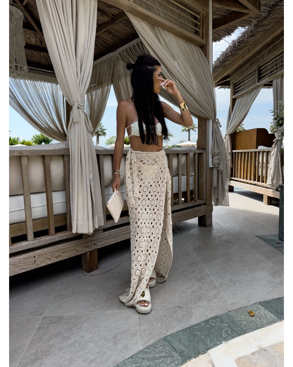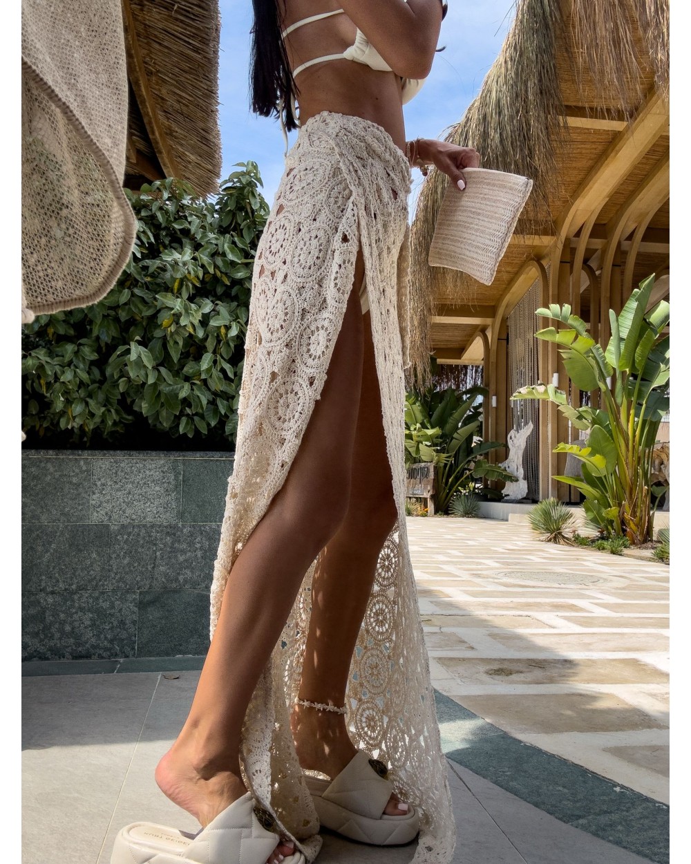 Stylowa i kobieca spódnica o długości maxi, wykonana z lekkiego, przewiewnego materiału, idealnego na cieplejsze dni. Subtelna ażurowa struktura dodaje jej unikalnego charakteru i delikatności. Wiązanie pozwala na regulację obwodu i idealne dopasowanie do sylwetki, a jednocześnie podkreśla talię.