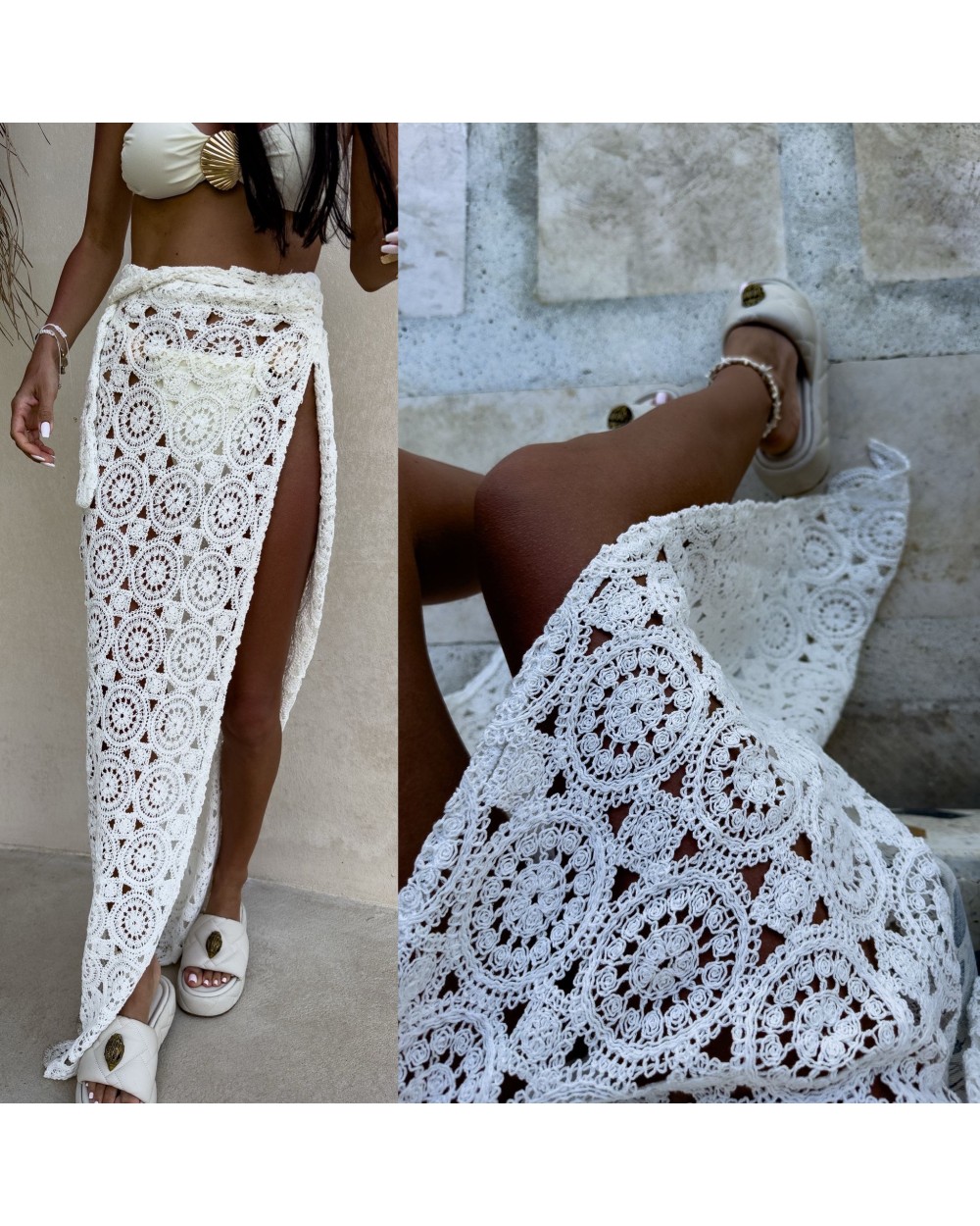 Stylowa i kobieca spódnica o długości maxi, wykonana z lekkiego, przewiewnego materiału, idealnego na cieplejsze dni. Subtelna ażurowa struktura dodaje jej unikalnego charakteru i delikatności. Wiązanie pozwala na regulację obwodu i idealne dopasowanie do sylwetki, a jednocześnie podkreśla talię.