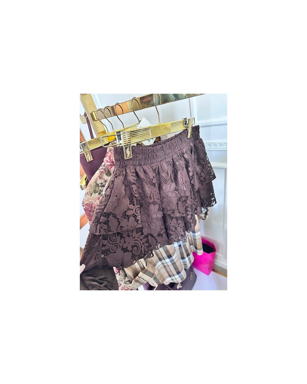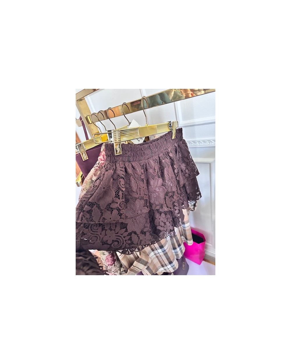 Długość short, koronkowe wykończenie oraz gumka w talii. Zdobienie w postaci falbanek.