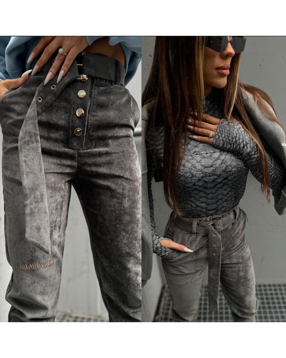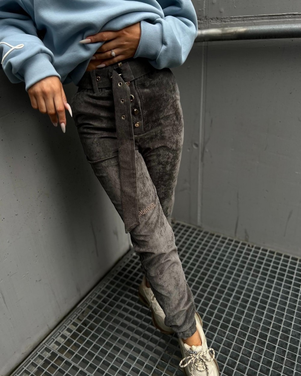 Spodnie damskie sztruksowe, które stanowią idealne połączenie elegancji, wygody i unikalnego stylu. Nasze spodnie, zapinane na suwak, zyskują wyjątkowy charakter dzięki ozdobnym złotym napom. To doskonały wybór dla kobiet, które pragną wyróżnić się w tłumie i podkreślić swoją indywidualność. Subtelne logo umieszczone na nodze spodni dodaje im elegancji. Te spodnie doskonale sprawdzą się zarówno w eleganckim zestawieniu, np. z koszulą i szpilkami, jak i w bardziej swobodnym, casualowym wydaniu z trampkami i luźniejszym topem. To produkt, który daje Ci pełną swobodę w kreowaniu swojego stylu.