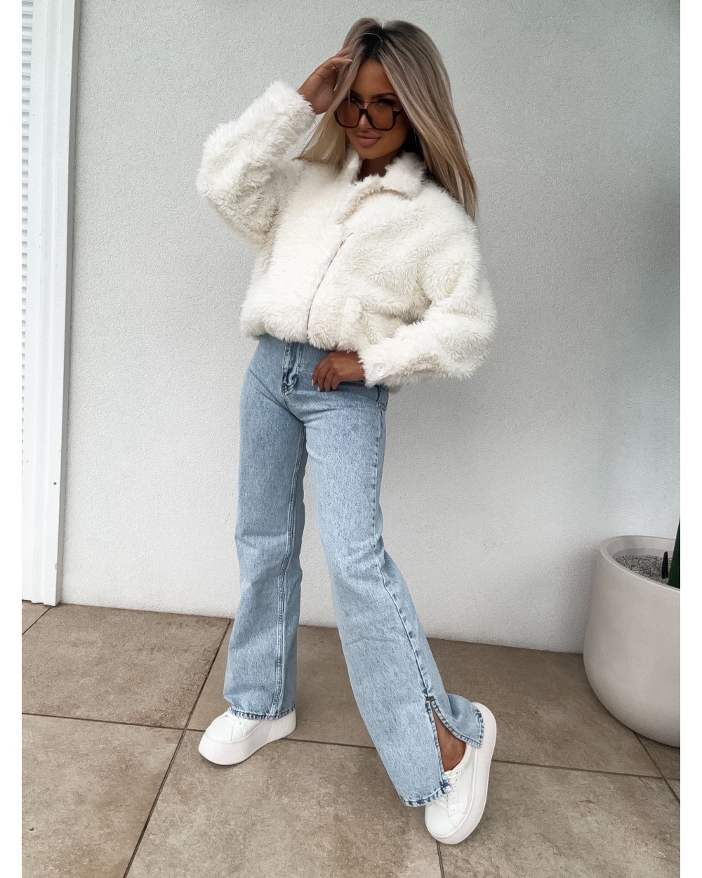 Jeansy Mom Fit sprawdzą się do wielu stylizacji. Zapinane na guzik, posiadają szlufki oraz kieszenie z przodu i z tyłu. Nogawki zakończone stylowym rozcięciem nadają im nowoczesnego charakteru i świetnie prezentują się zarówno z trampkami, jak i botkami.