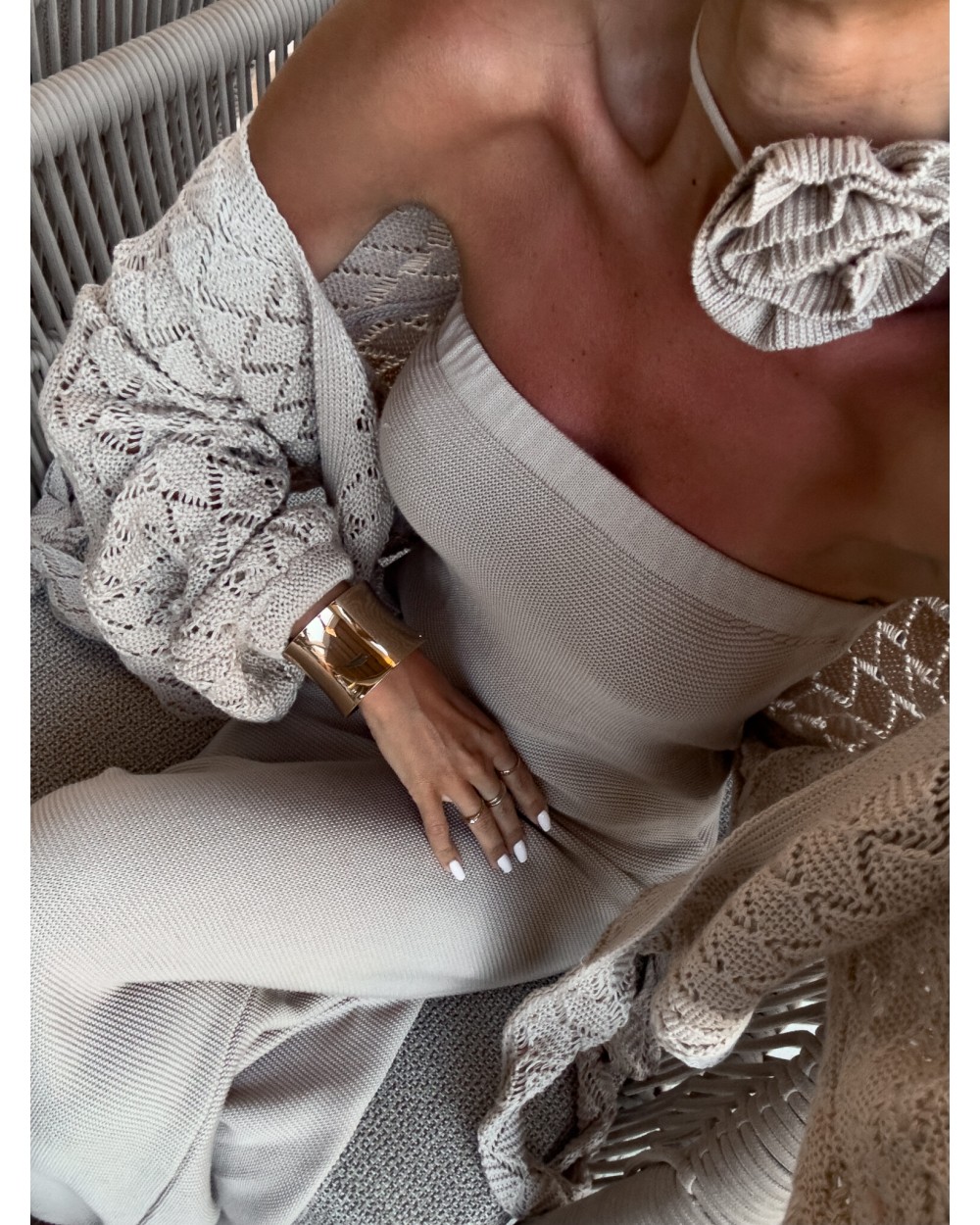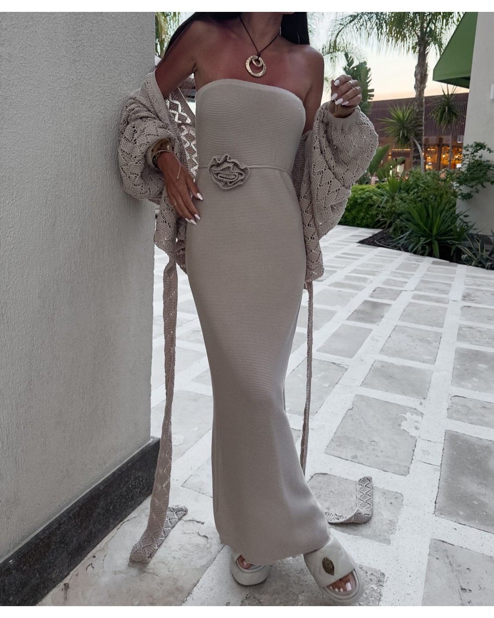 Zmysłowa i kobieca sukienka maxi z odkrytymi ramionami to idealny wybór na wyjątkowe okazje. Wykonana z lekkiego, zwiewnego materiału, subtelnie opływa sylwetkę, podkreślając jej atuty. Dekolt wykończony elastyczną gumką zapewnia wygodę noszenia i doskonałe dopasowanie, a rozcięcie z boku dodaje stylizacji nuty zmysłowości i lekkości. Uwagę przyciąga przepiękny, odpinany kwiat, który możesz dowolnie stylizować – noś go na sukience, wpięty we włosy lub przy torebce. Idealna na specjalne okazje, romantyczne kolacje czy letnie przyjęcia.