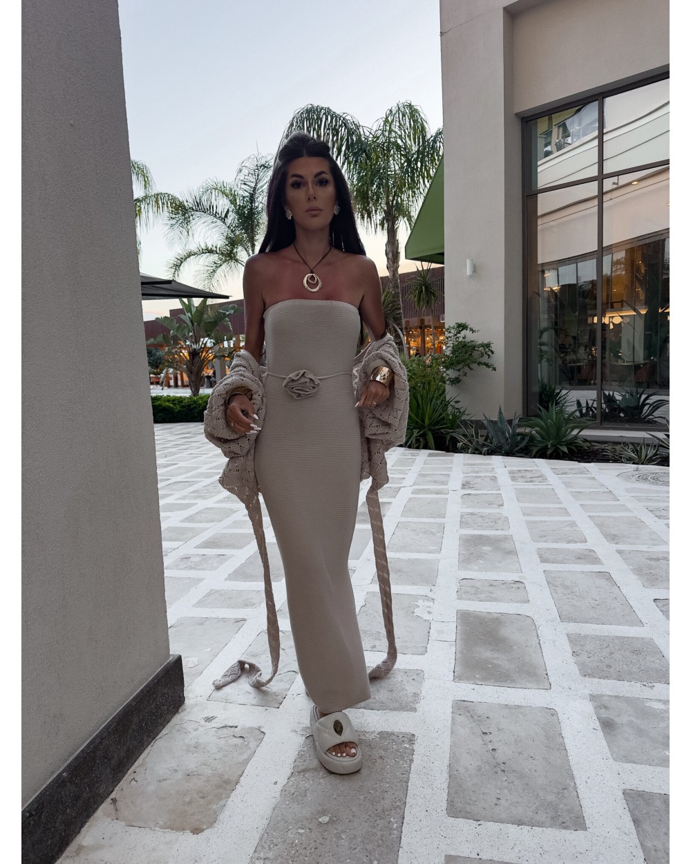 Zmysłowa i kobieca sukienka maxi z odkrytymi ramionami to idealny wybór na wyjątkowe okazje. Wykonana z lekkiego, zwiewnego materiału, subtelnie opływa sylwetkę, podkreślając jej atuty. Dekolt wykończony elastyczną gumką zapewnia wygodę noszenia i doskonałe dopasowanie, a rozcięcie z boku dodaje stylizacji nuty zmysłowości i lekkości. Uwagę przyciąga przepiękny, odpinany kwiat, który możesz dowolnie stylizować – noś go na sukience, wpięty we włosy lub przy torebce. Idealna na specjalne okazje, romantyczne kolacje czy letnie przyjęcia.
