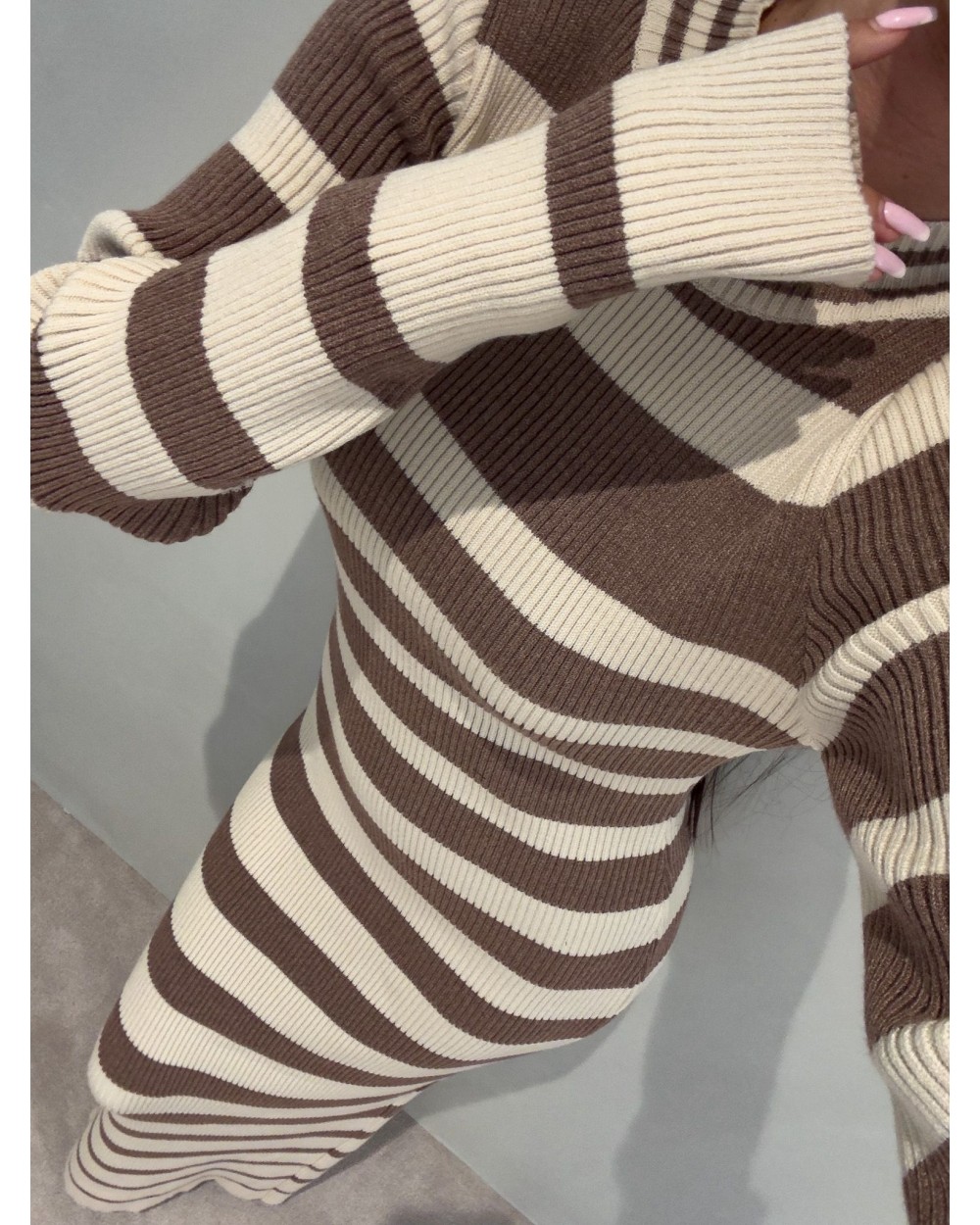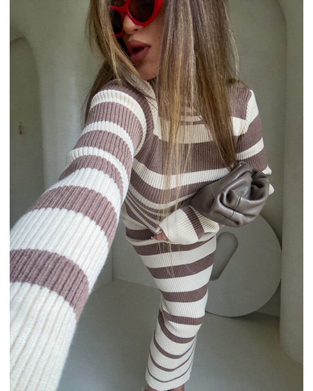 Dzianinowa sukienka, dopasowana w klasyczne poziome pasy. Na długi rękaw, sięga do kostek, co nadaje jej elegancki i minimalistyczny wygląd. Wzór pasków jest regularny, co optycznie podkreśla sylwetkę. Materiał prążkowany dzianinowy splot, który dobrze układa się na ciele.