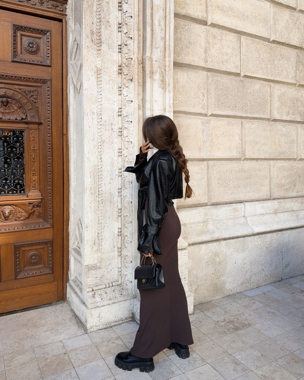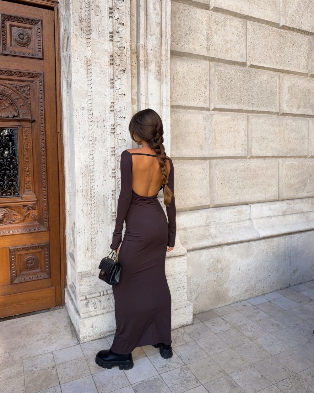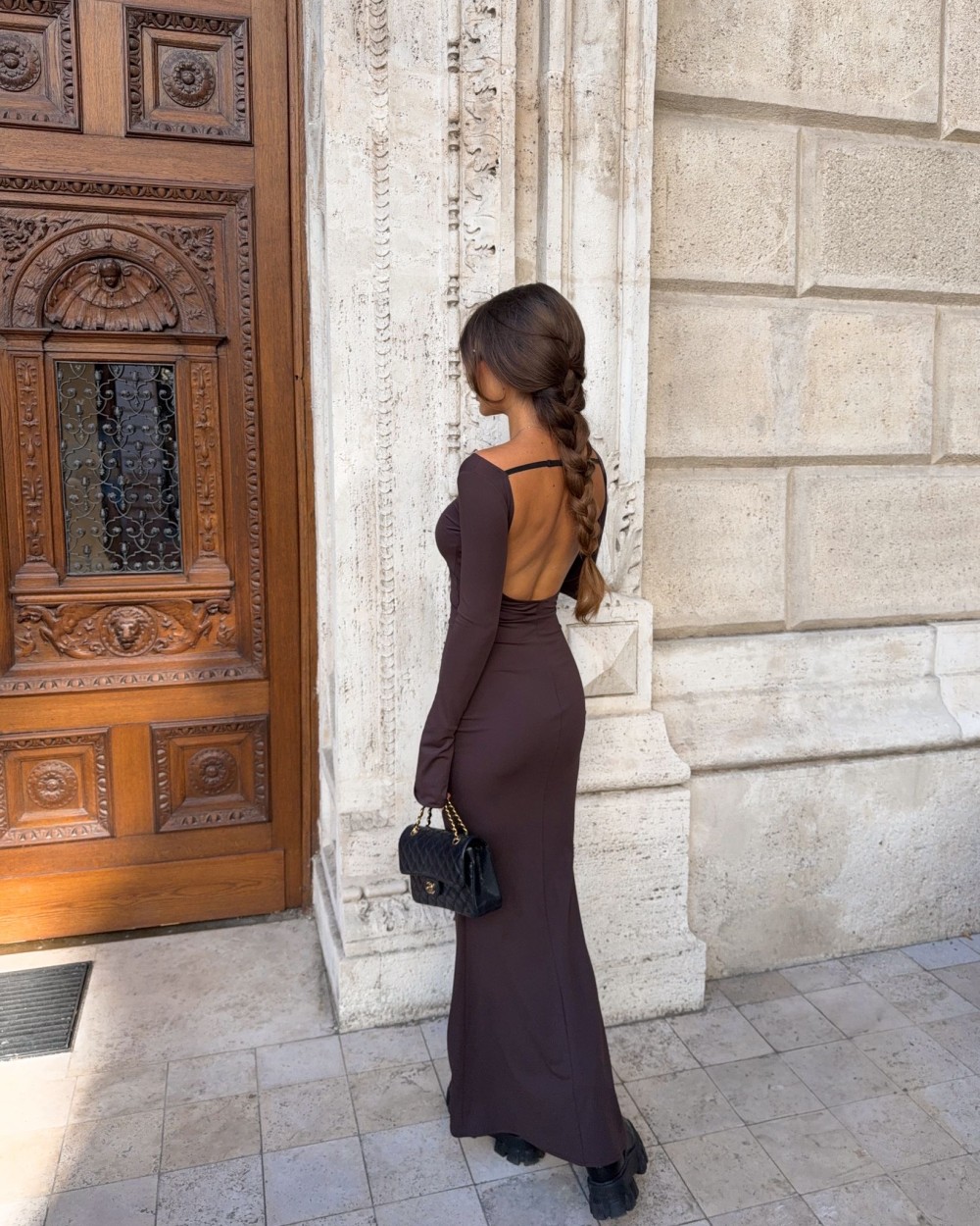 Długość maxi, wyeksponowane plecy. Dopasowany krój.