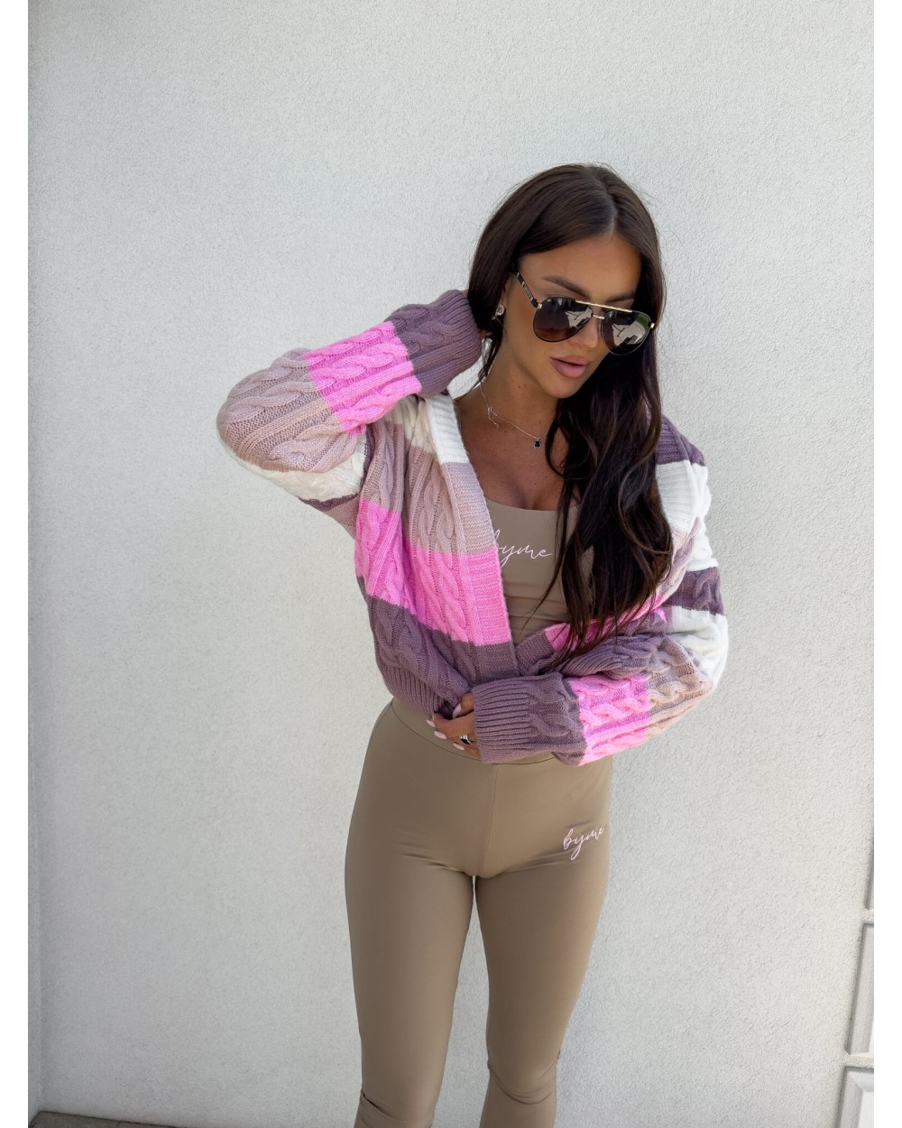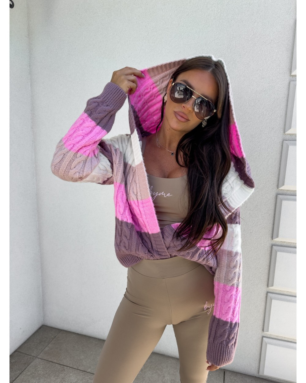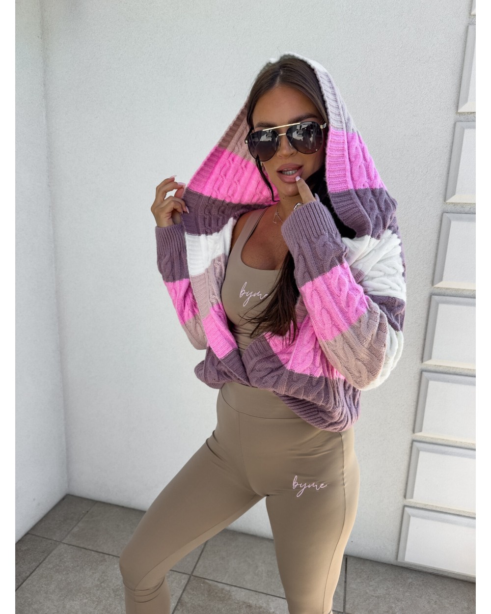 Sweter dzianinowy z kapturem, wykonany z grubego, plecionego materiału o wyrazistym splocie. Rękawy i dół swetra zakończone ściągaczem.