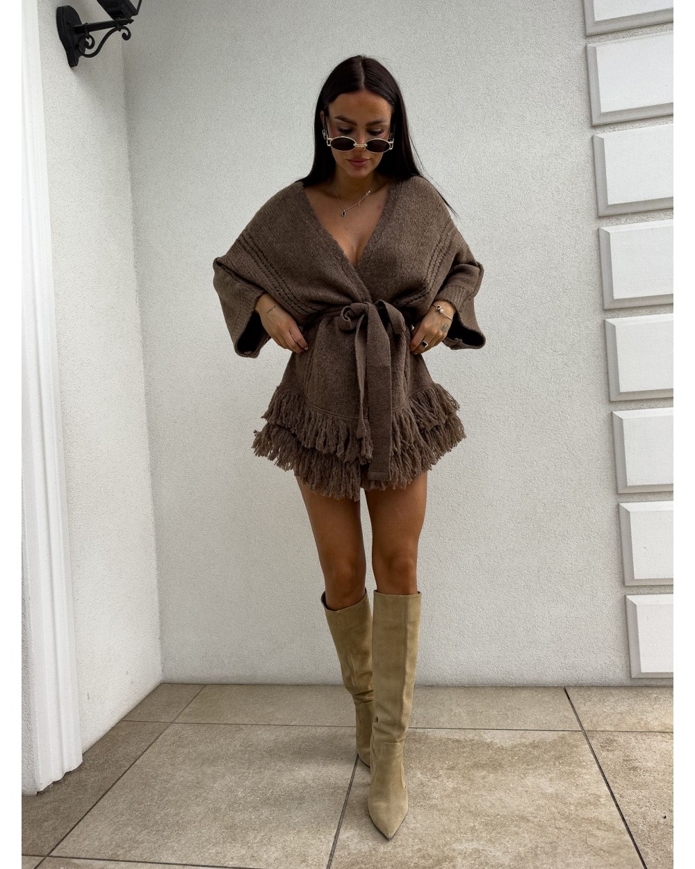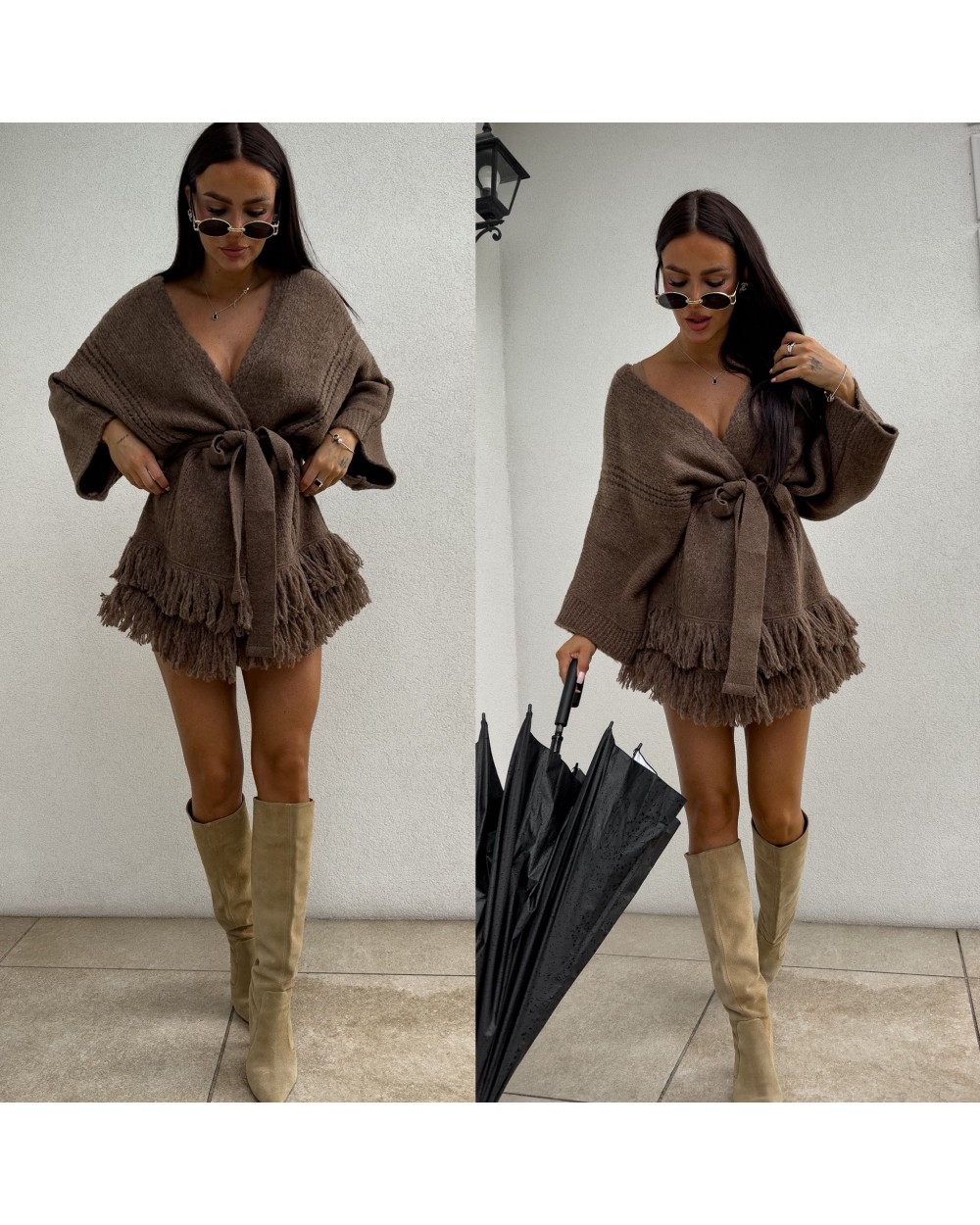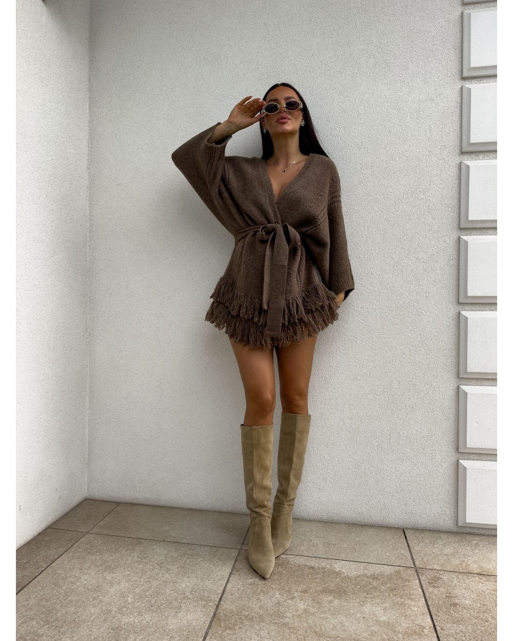Podkreśl swój styl z kardiganem Oriana. Kardigan ma luźny, otwarty fason, a talię można podkreślić dołączonym paskiem, dzięki czemu sylwetka nabiera kobiecego kształtu. Dół kardiganu ozdobiony frędzlami, które nadają mu lekkości i boho charakteru.