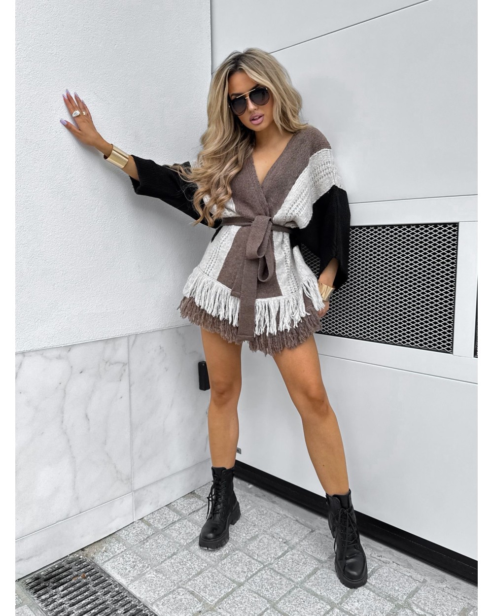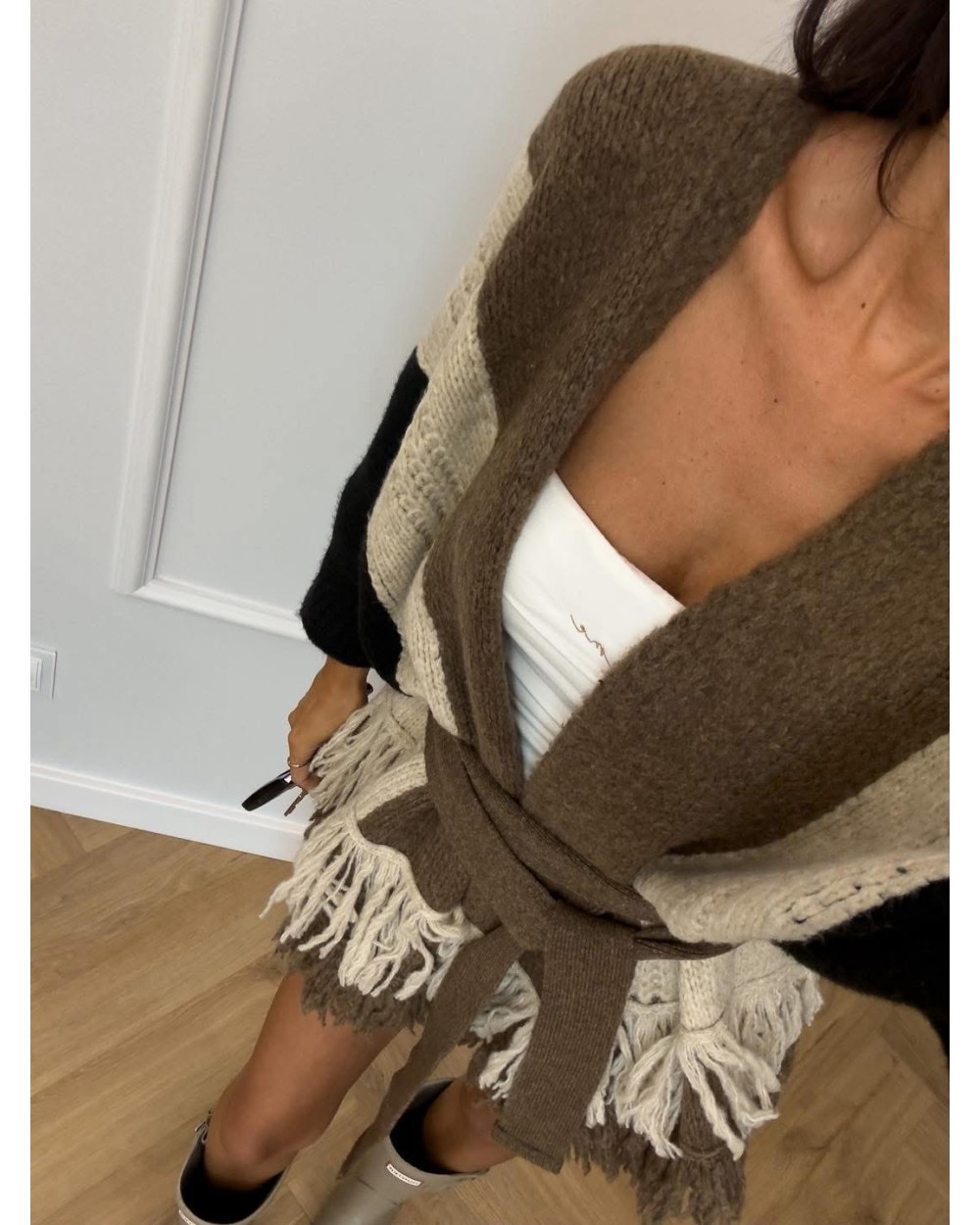 Podkreśl swój styl z kardiganem Oriana. Kardigan ma luźny, otwarty fason, a talię można podkreślić dołączonym paskiem, dzięki czemu sylwetka nabiera kobiecego kształtu. Dół kardiganu ozdobiony frędzlami, które nadają mu lekkości i boho charakteru.