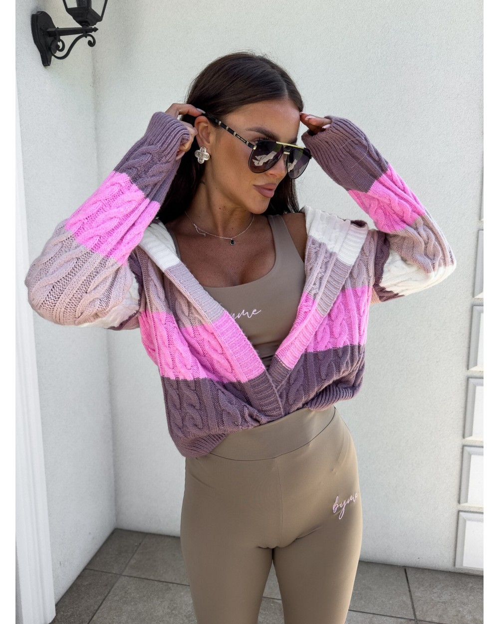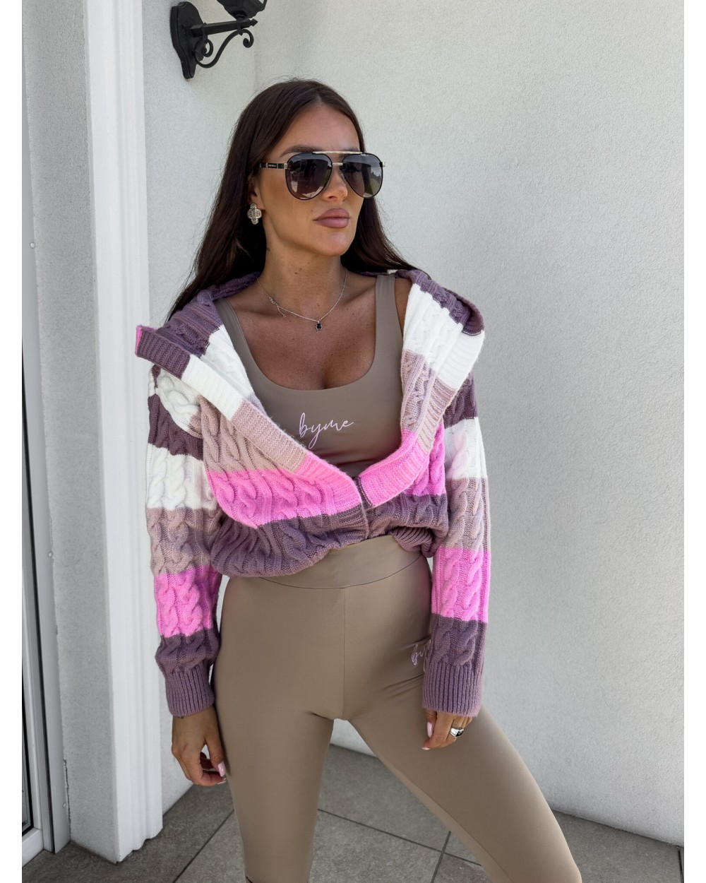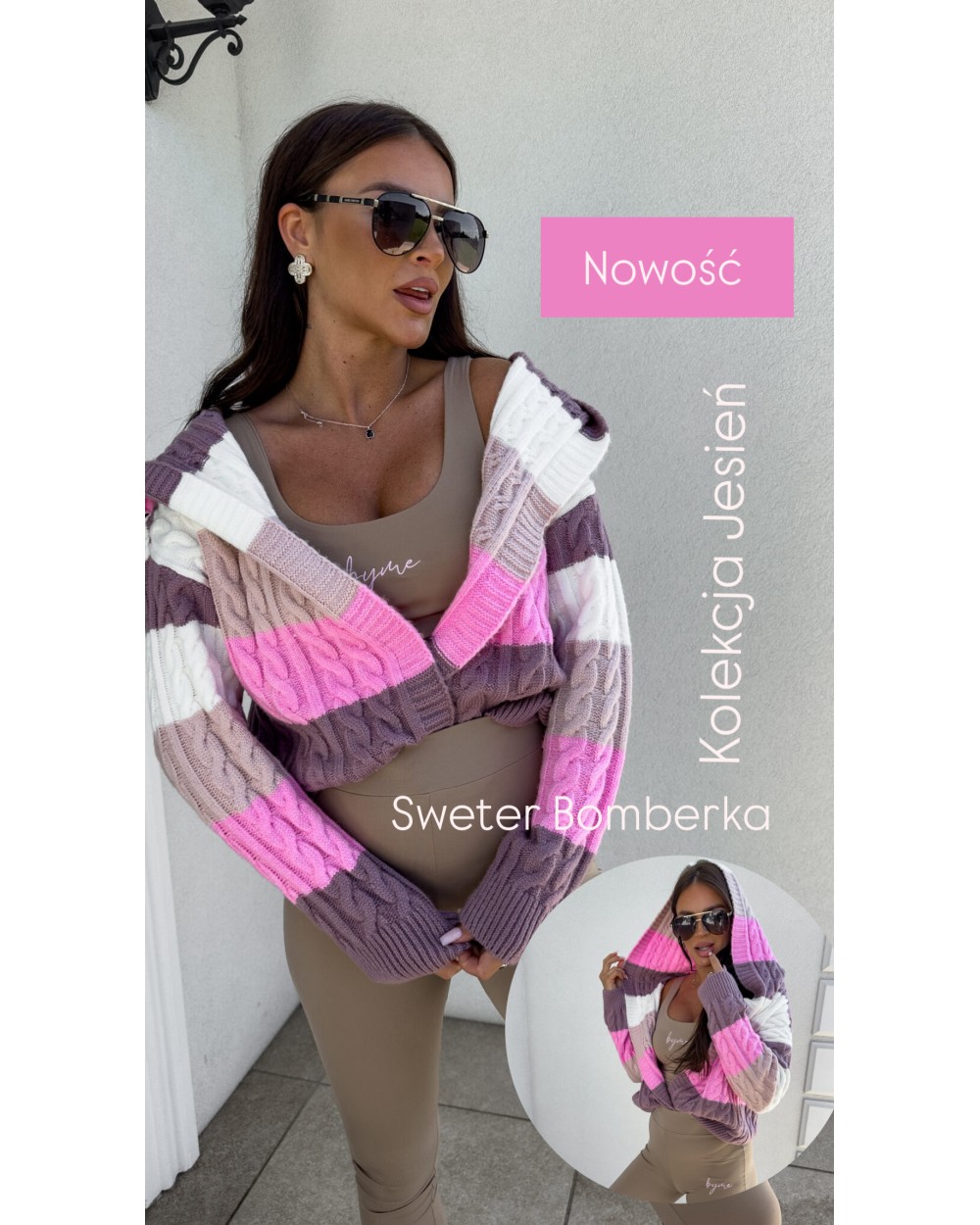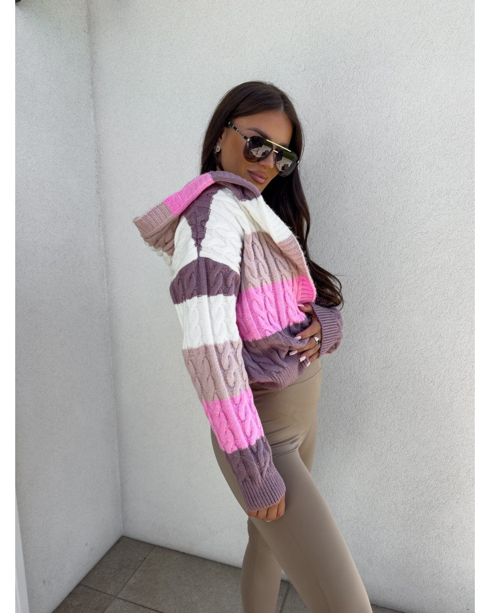 Sweter dzianinowy z kapturem, wykonany z grubego, plecionego materiału o wyrazistym splocie. Rękawy i dół swetra zakończone ściągaczem.