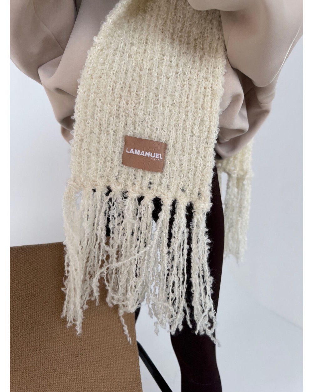 Mięsisty szalik z grubym splotem i długimi frędzlami. Wyróżnia się charakterystyczną fakturą i widoczną naszywką z logo. Otula szyję i dodaje stylu każdej zimowej stylizacji.