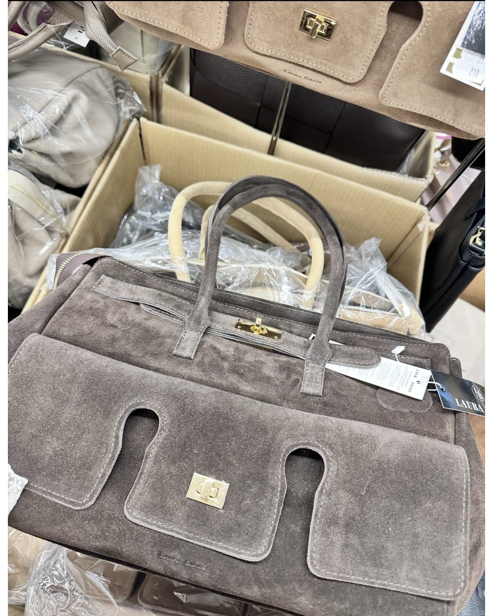 Elegancka stylowa torba wykonana z zamszu w większym rozmiarze. Torebka nada każdej stylizacji klasy i szyku . Model niezwykle podręczny i funkcjonalny. Z przodu znajduje się ciekawa kieszeń która doda funkcjonalności wyjątkowego wyglądu, Wnętrze składa się z obszernej komory z kieszonką na telefon lub drobiazgi. Torebka jest bardzo pojemna pomieści bez problemu dokumenty A4, tablet Okucia w kolorze złotym. Torebka posiada wygodne rączki skórzane i pasek.