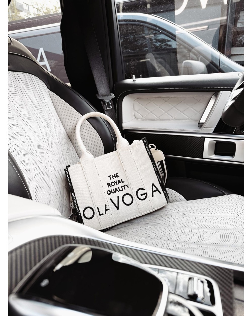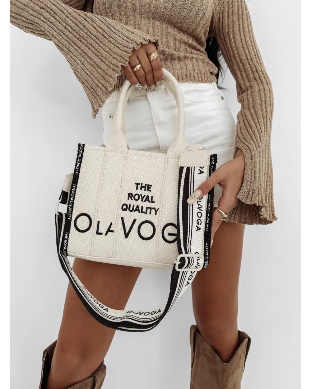 Mini torebka typu shopper o nowoczesnym designie. Wykonana z solidnego, tekstylnego materiału, ozdobiona wyrazistym logo OLAVOGA oraz kontrastowymi taśmami z nadrukiem THE ROYAL QUALITY. Posiada krótkie uchwyty do noszenia w dłoni, praktyczne zapięcie na zamek i wewnętrzną kieszonkę.